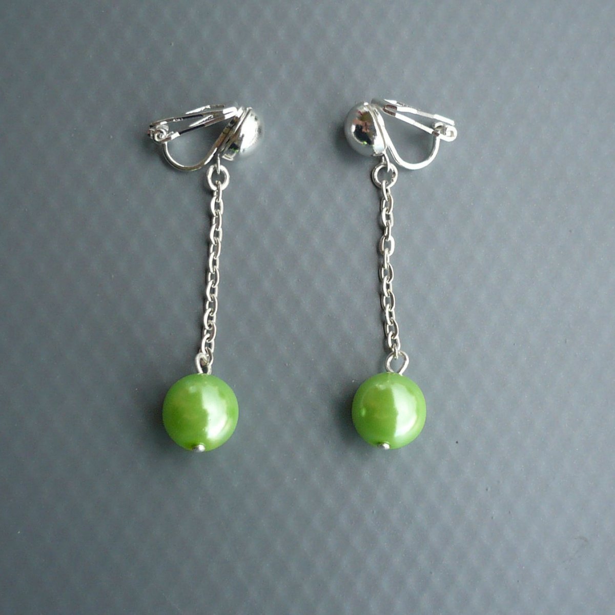 Náušnice jsou tvořeny z řetízku stříbrné barvy, na kterém je zavěšena krásná jarně zelená velká česká voskovaná perlička.