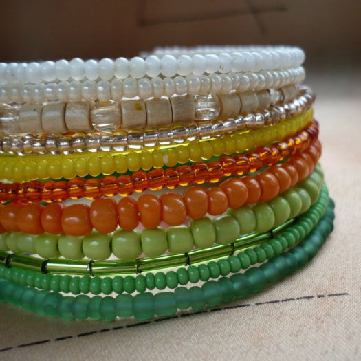 Pestrobarevný jarní náramek z paměťového drátu, rokajlu, tyčinek a dřevěných korálků - 12 otoček, průměr 6 cm, šířka 4 cm.