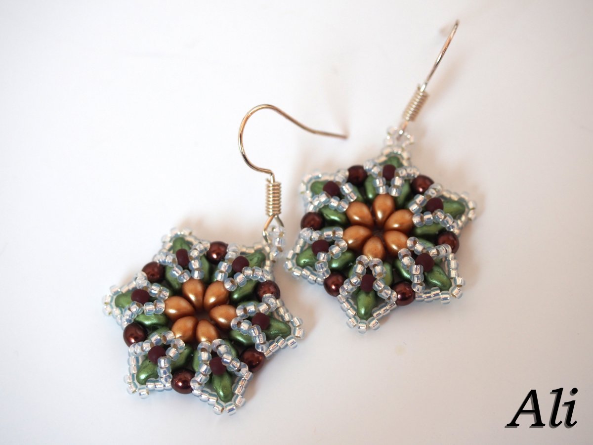 Náušničky jsou zavěšeny na afroháčku z bižuterního kovu stříbrné barvy. Po dohodě lze vyměnit za jiný materiál vhodnější pro alergiky. Budou dodány s plastovou zarážkou proti sesunutí náušnice.