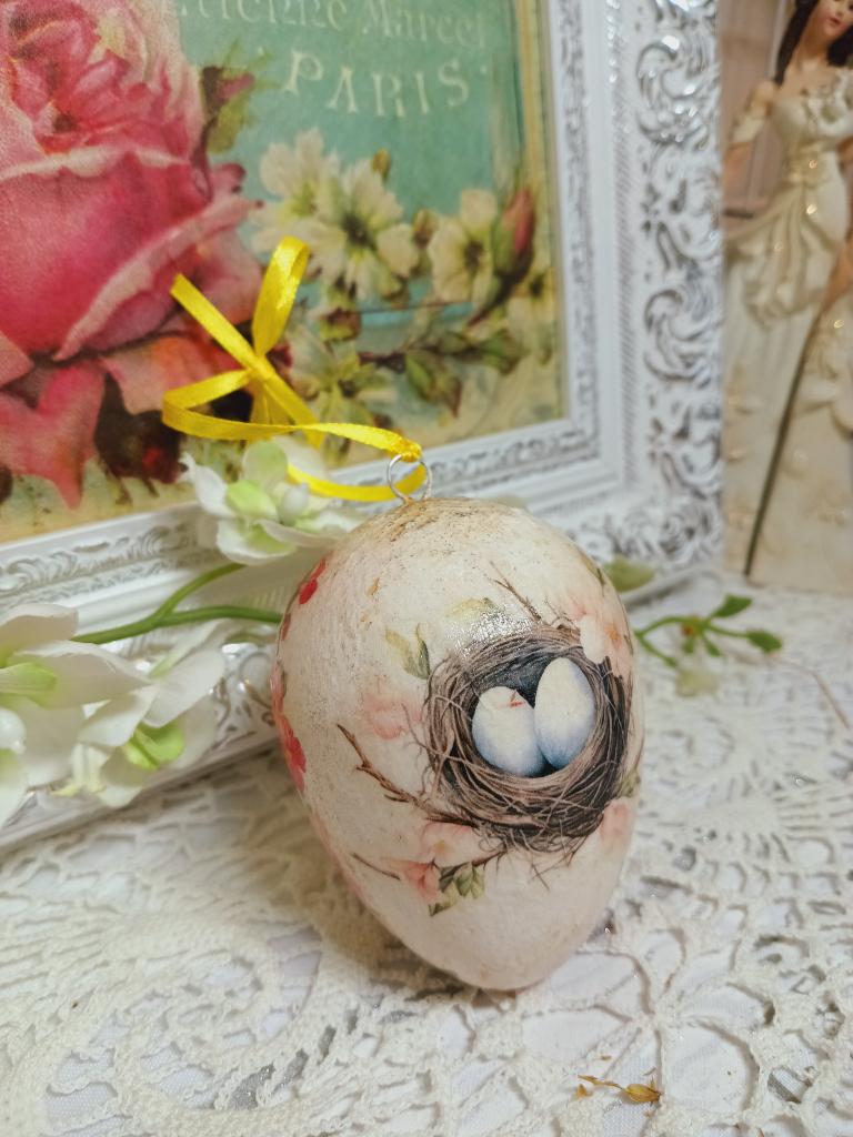 Velikonoční vajíčko s motivem ptačího hníza a ptačí budky s modrými ptáčky, okolo hlavních motivů je květinková bordura. Celé vajíčko je krakelované a patinované do vintage stylu. je vhodné k zavěšení na větvičku, do věnečku, okna nebo jen volně položené, či do různých jarních dekorací.