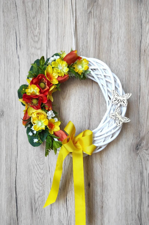 Jarní proutěný bílý věnec ve žlutooranžovém ladění k zavěšení na stěnu nebo na dveře, střední velikosti. Je ozdoben látkovými květy pryskyřníků, sasanek, tulipánů, konvalinek, zelenými listy a dalšími přízdobami.