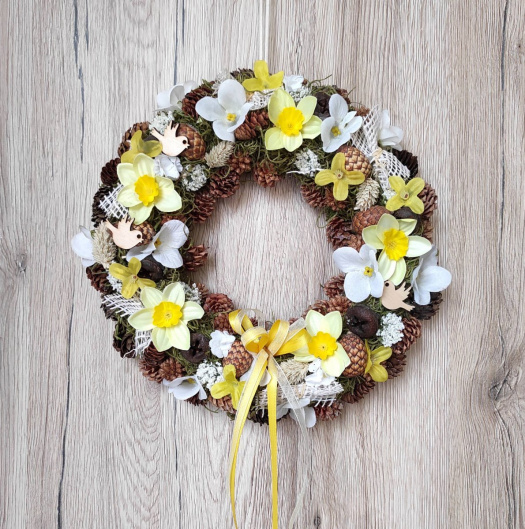 Svěží jarní věnec do žlutobílého ladění k zavěšení na stěnu nebo na dveře, střední velikosti. Je bohatě zdobený různými druhy suchých plodů, kvalitními látkovými květy a dalšími přízdobami.