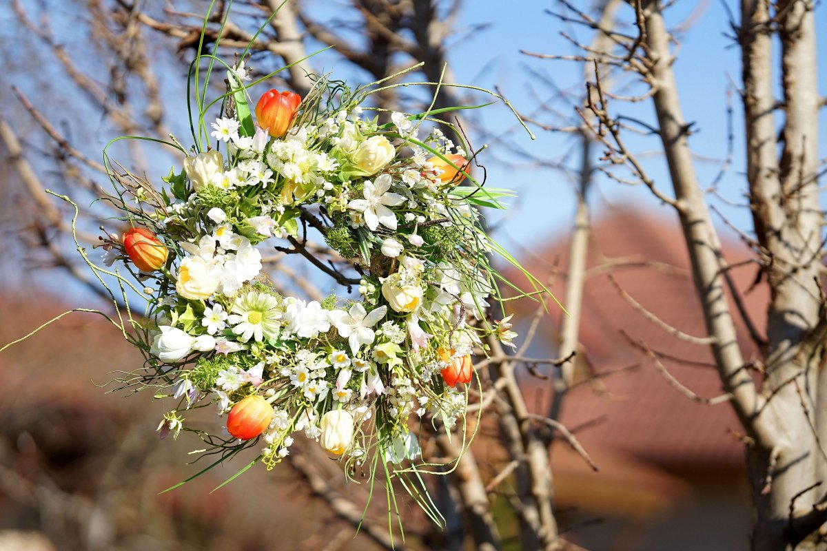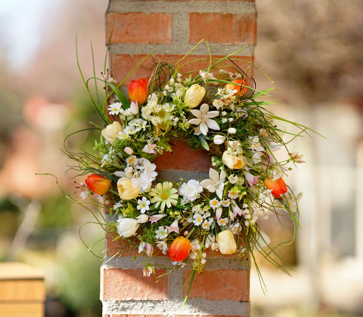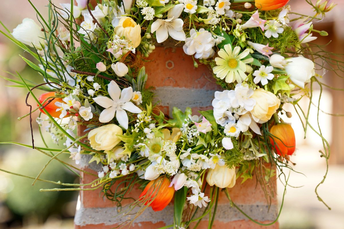Pestrý jarní věnec ve volném vzdušném provedení. Tulipány jsou latexové a pěnové a působí velmi realisticky. Hlavní průměr věnce je 35cm, po špičky zelených větviček, které jsou tvarovatelné může mít věnec až 50+ cm.
