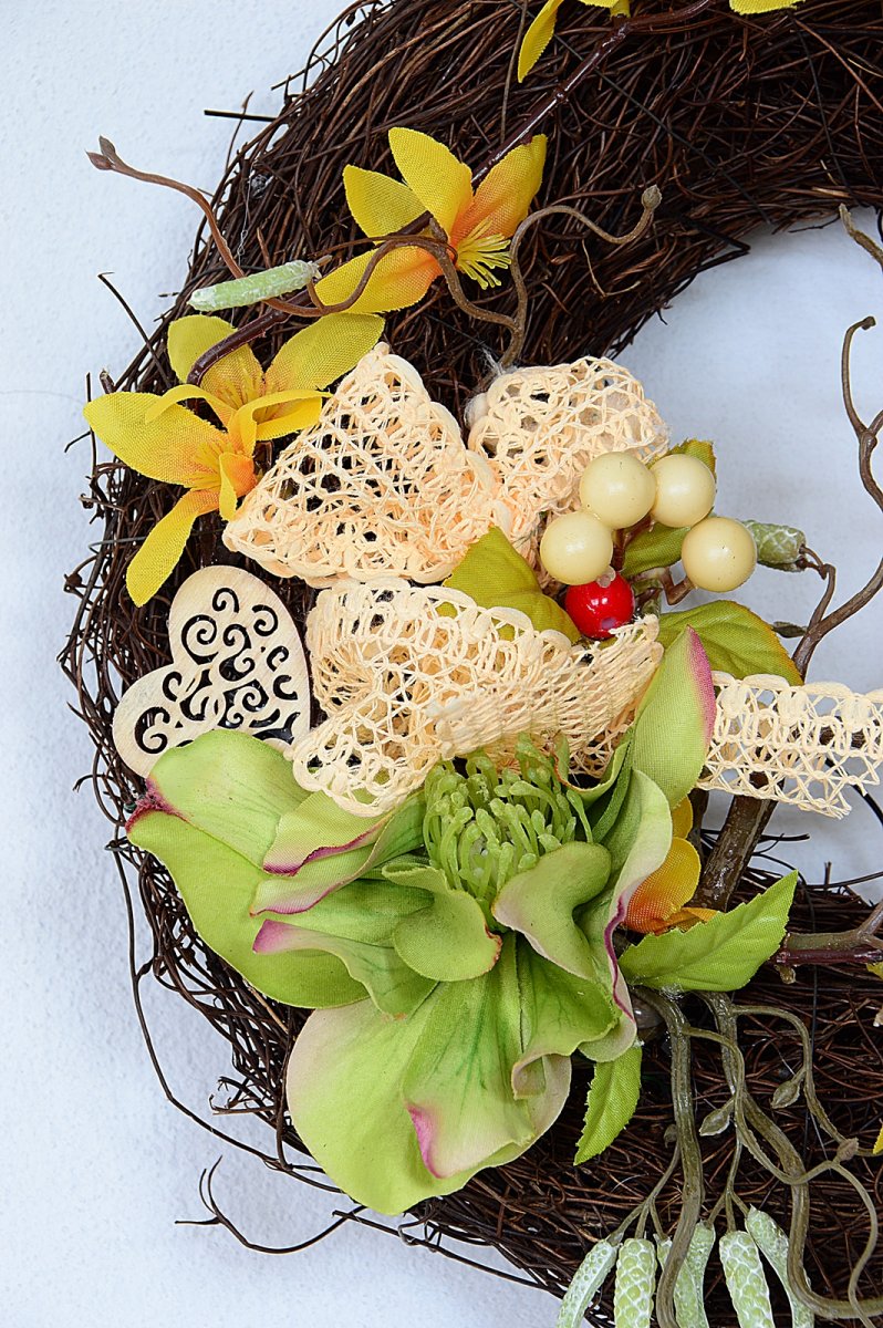 Přírodní proutěný s umělými pěknými větvičkami a stužkou + dřevěným srdíčkem.
