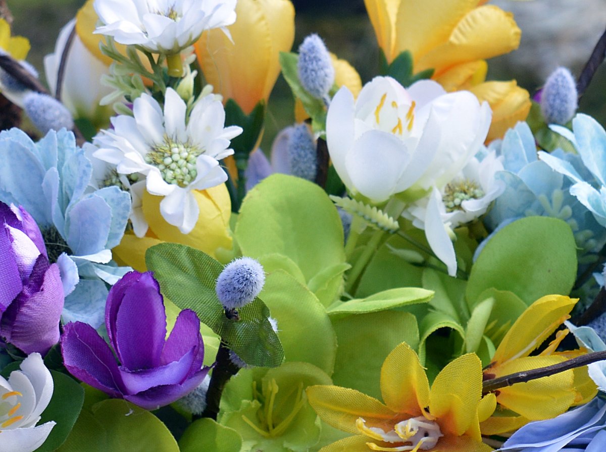 Trvanlivá dekorace s jarními umělými květinami, větvičkami kočiček v kovovém zdobeném truhlíku .Velikost na výšku je 22 cm/ délka 35 cm a šířka cca 24 cm.