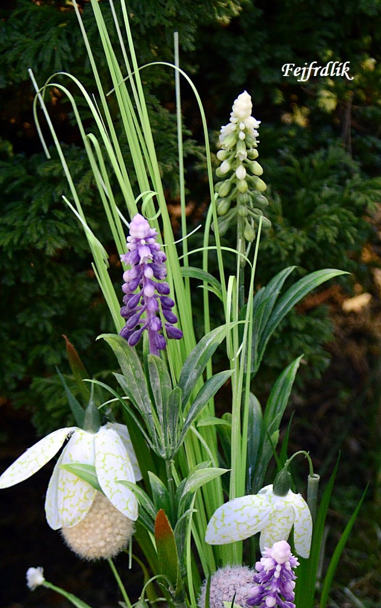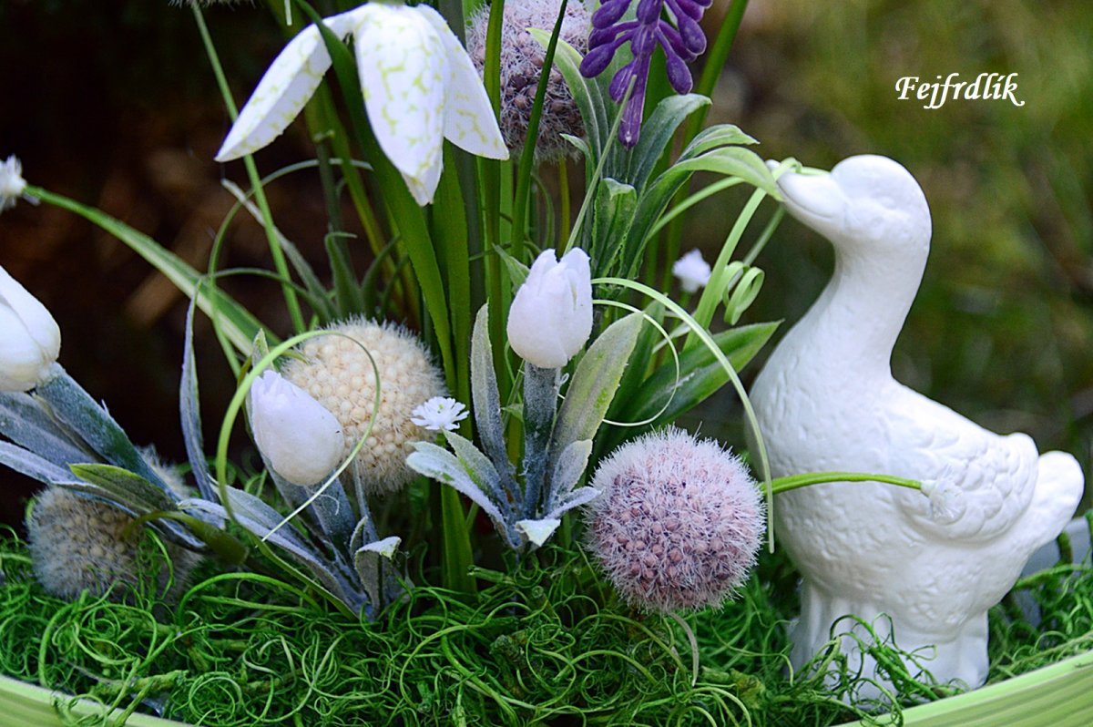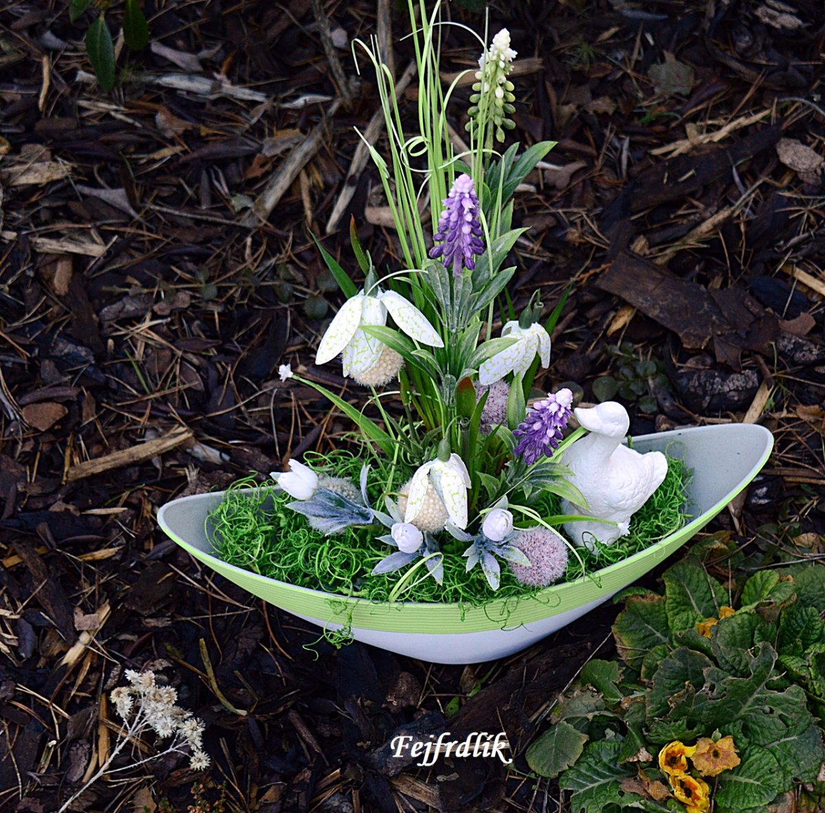 Jarní dekorace v plastové lodičce s keramickou husou (litá keramika), umělými květinami o výšce 49 cm / délka 35 cm/ šířka 17 cm.