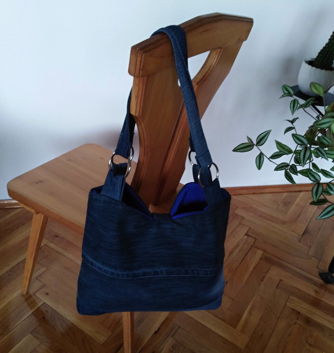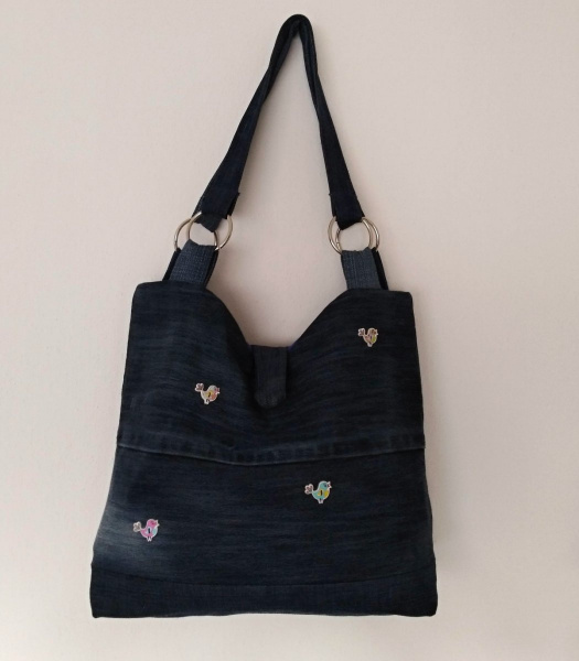 Lehká a hravá taška z modré recyklované rifloviny, která přináší jarní náladu po celý rok. Na přední straně ji zdobí ručně našité dřevěné knoflíky ve tvaru ptáčků, které dodávají tašce osobitý šmrnc.