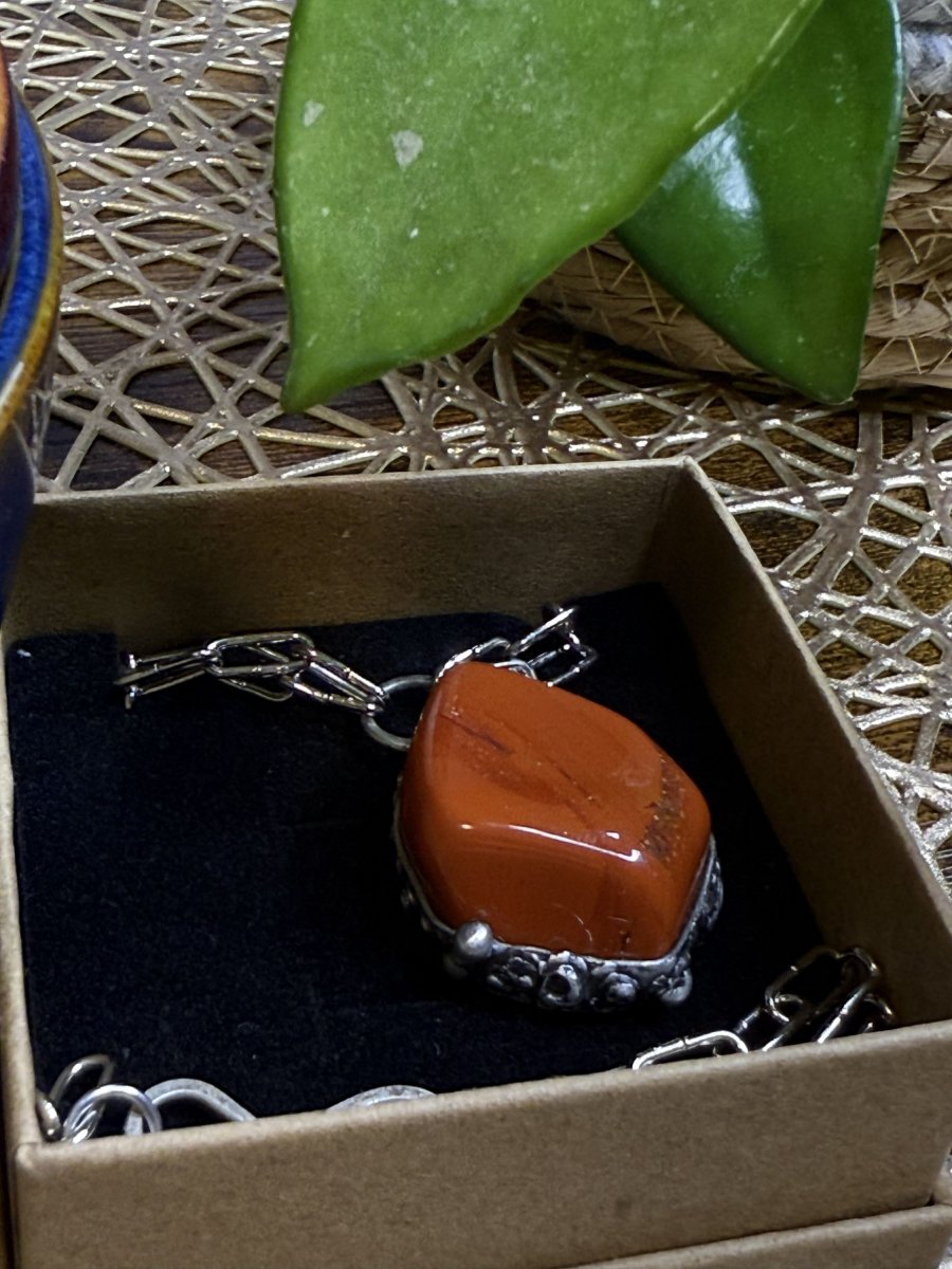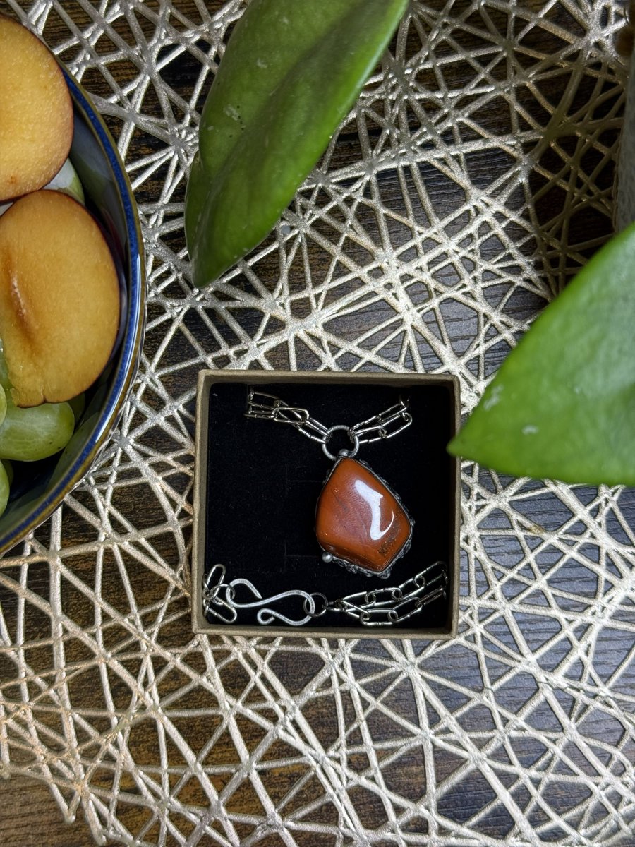 Náhrdelník s červeným JASPISEM. Vyrobeno z bezolovnatého cínu. Černá patina, obroušena, takže dává šperku starostříbrný vzhled. Vše ošetřeno antioxidačním olejem a vyleštěno karnaubským voskem.