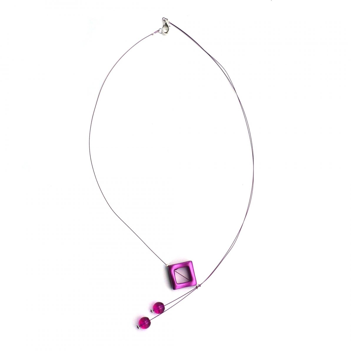 Náhrdelník tvoří růžové bižuterní lanko a horní větší metalický růžový čtvercový plastový korálek a spodní růžové kulaté korálky.