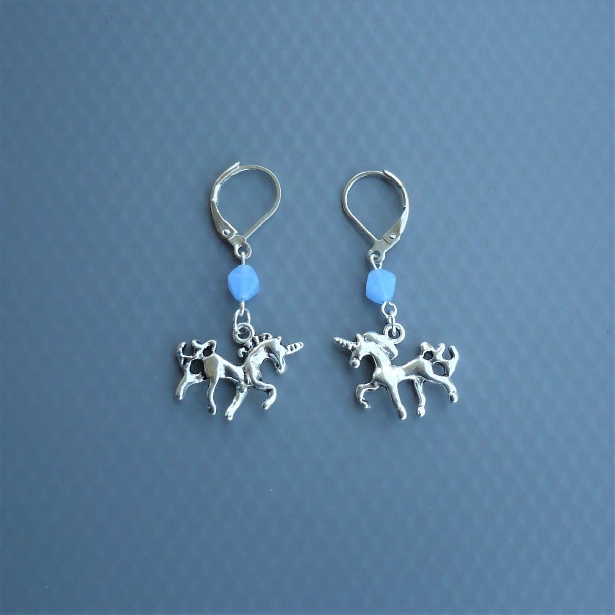 Nejen dětské náušnice z horního světle modrého tvarovaného korálku a spodního kovového oboustranného přívěšku v podobě jednorožce.