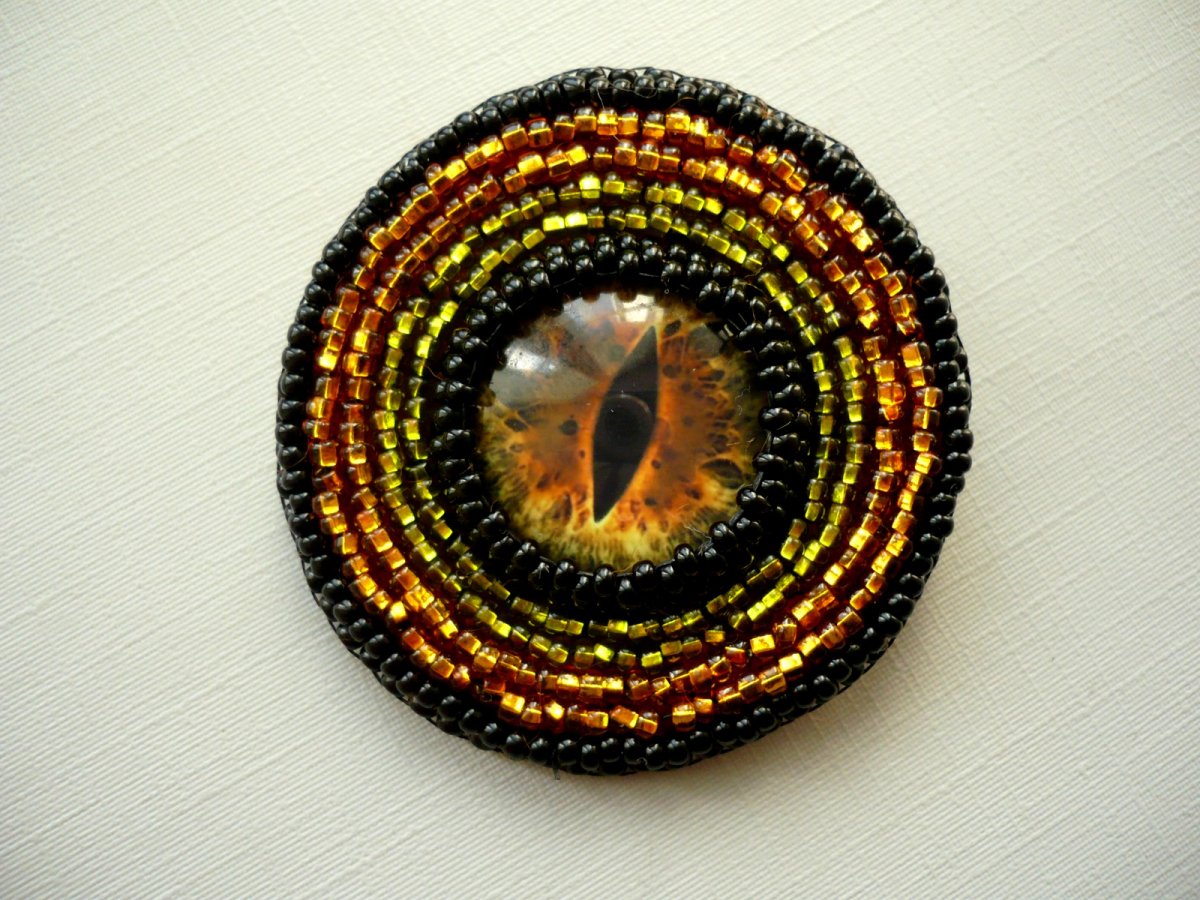 Ručně vyšívaná brož technikou beadweaving. Uprostřed brožky je skleněný kabošon obšitý rokajlem, vše je podloženo hnědou plstí, na zadní straně je brožový špendlík s pojistkou. Průměr brože 45 mm. Vhodné na kabát či kabelku...