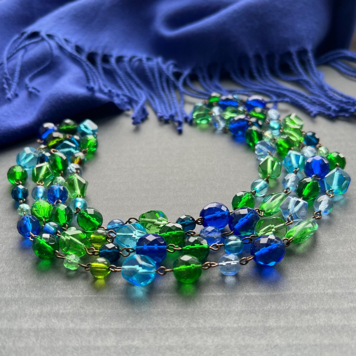 Dlouhý ketlovaný náhrdelník z větších skleněných broušených korálků. Délka 136 cm, lze omotat 2x kolem krku. Bez zapínání - na přání můžu přidělat karabinku