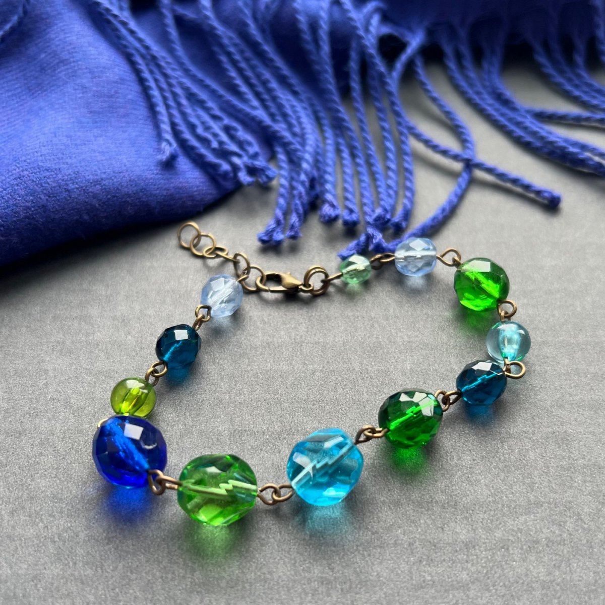 Ketlovaný náramek z broušených skleněných korálků. Délka 19 cm, zapínání na karabinku, prodlužující řetízek (max 22 cm), délku můžu na přání upravit