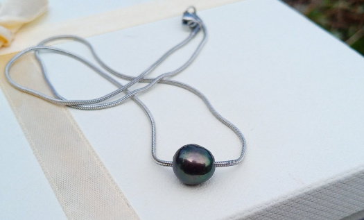 Tmavá dokonale lesklá jihomořská perla o velikosti cca 10 mm v AAA kvalitě zasazená do jemného řetízku z chirurgické oceli o délce 45 cm se zapínáním na kulatou karabinku. V případě zájmu mohu přidělat prodlužovací řetízek. Perla vyniká nádhernými duhovými perleťovými odlesky do tmavě zelené.