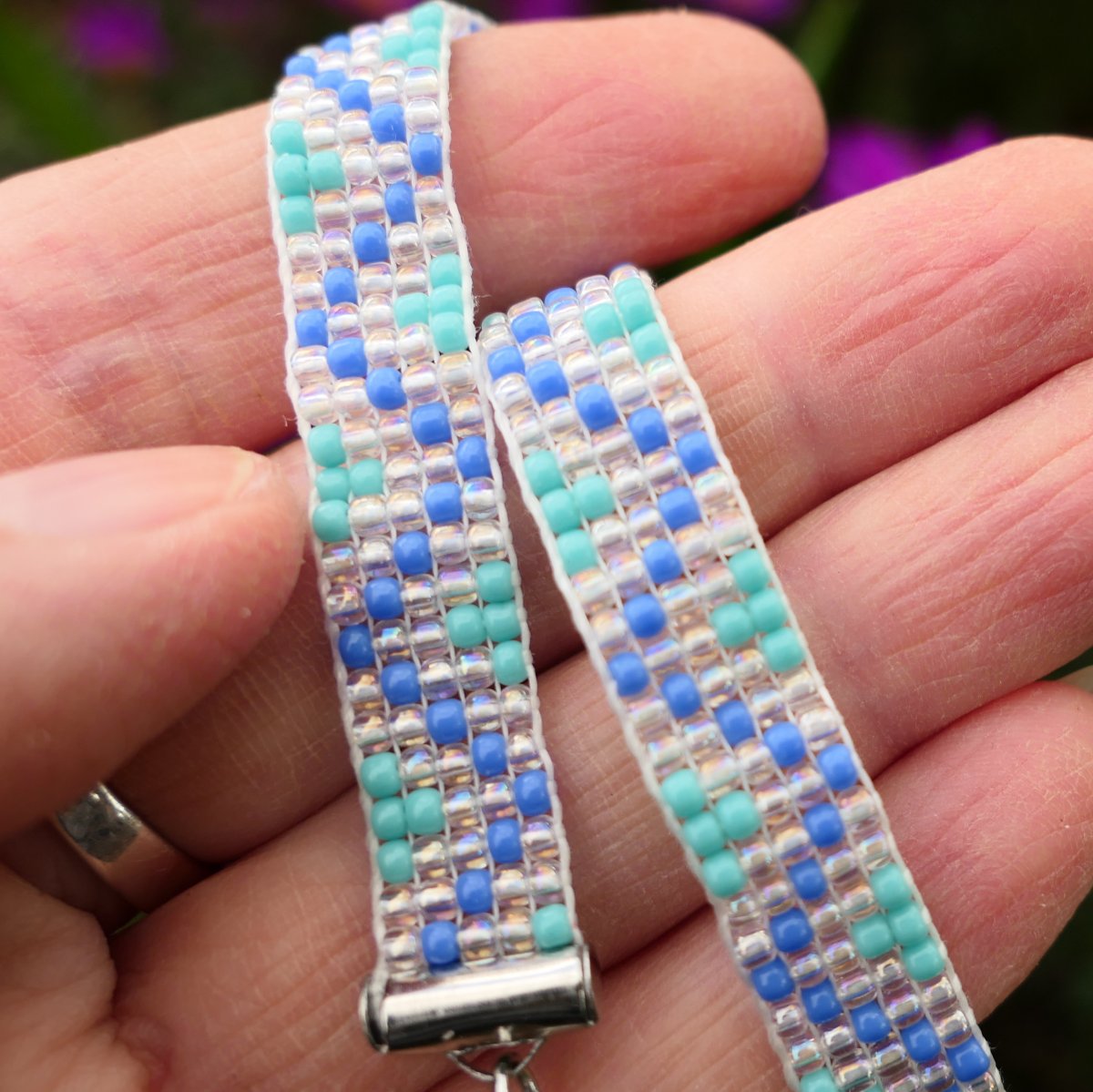 Náramek ručně tkaný na korálkovém stávku, šířky 0,9 cm, zapínání na nerez karabinku. Koncovky z nerezu. Celková délka 18 cm. Barva modrá, tyrkysová a čirá s listrem AB. Japonský rokail TOHO.