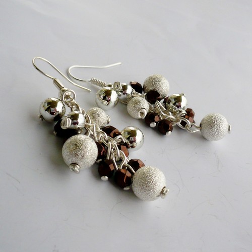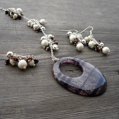 Originální souprava se skládá z náhrdelníku a náušnic. Náhrdelník: Výrazný oválný plastový přívěsek s fialovohnědým kárem a zalisovanými stříbrnými třpytkami je usazen do středu náhrdelníku. Po obou stranách náhrdelníku vede až k samotnému zapínání řetízek s několika chumlíčky z broušených hnědých, akrylových stříbrných a kovových stříbrných třpytivých korálků. Obvod náhrdelníku je pomocí prodlužovacího řetízku nastavitelný od 49,5 po 55 cm. Velikost přívěsku je 5,2x4,2x0,5 cm. Zapínání je na karabinku a prodlužovací řetízek. Použité kovové komponenty jsou z obecného kovu a jsou stříbrné barvy. Náušnice: Náušnice jsou tvořeny "chumlíčky" ze stejných korálků jako na náhrdelníku. Zapínání je na otevřený afroháček stříbrné barvy - plastovou zarážku proti vypadnutí dodávám společně s náušnicemi. Celková délka náušnice včetně zapínání je 4,5 cm.