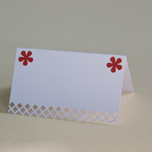 Bílé jmenovky na svatební stůl s tmavě červenými kytičkami (barva aplikace lze na přání změnit). Jména si můžete dopsat ručně nebo vytisknout a nalepit.