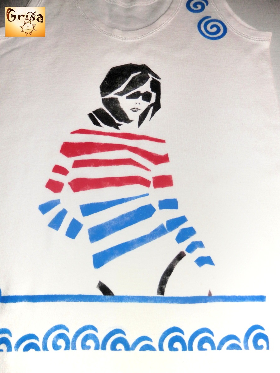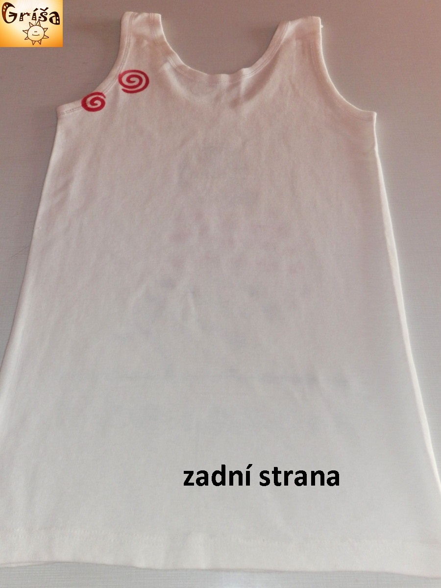 Tílko s potiskem přes vlastnoručně vystříženou šablonu, doplněno razítky.