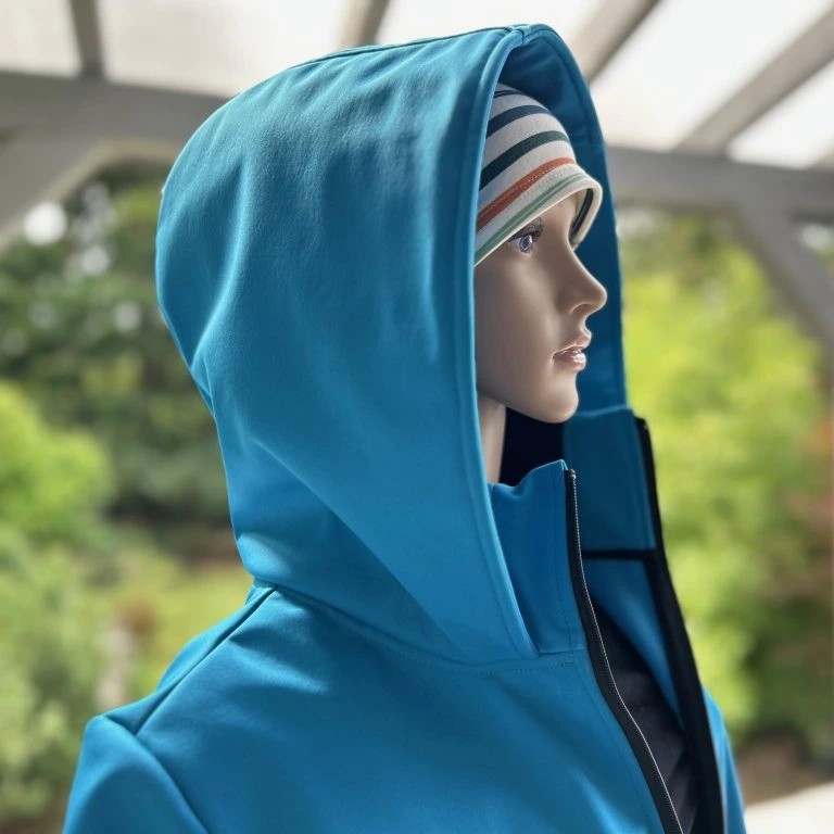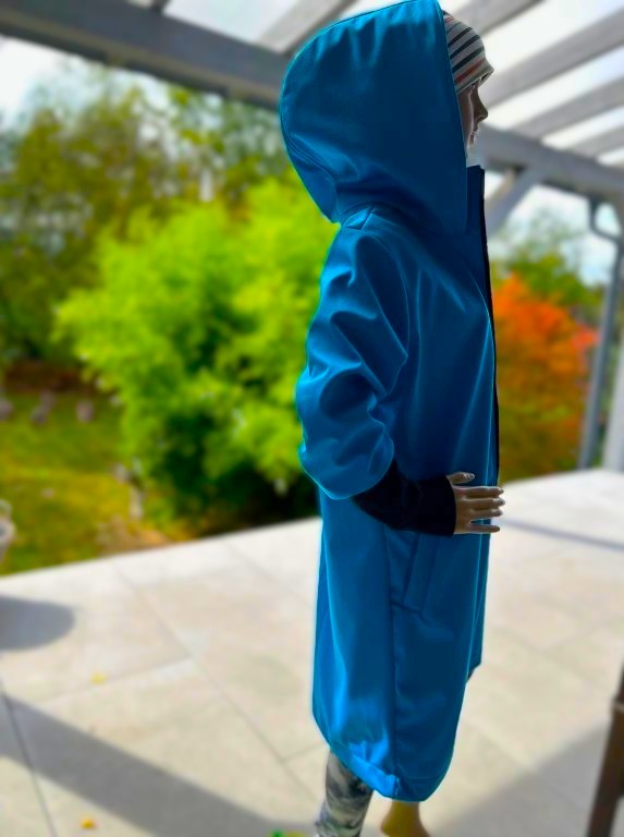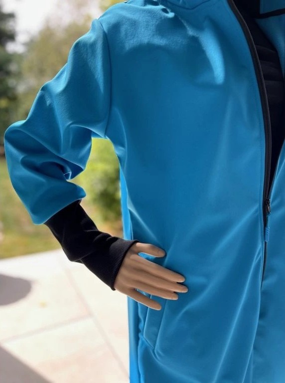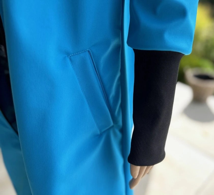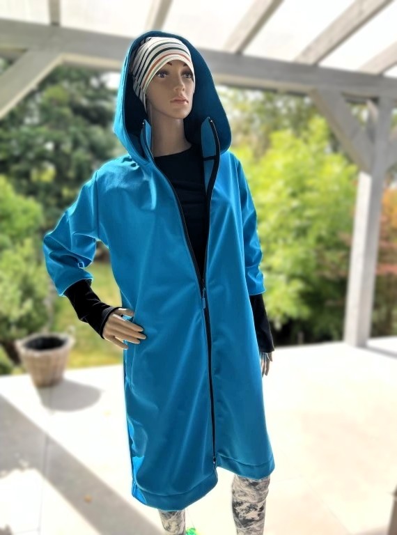 Dlouhý sofshellový kabát v krásné světle tyrkysové barvě, na zapínání dvoucestným zipem, zapnete nebo rozepnete ze dvou stran. Praktický stojáček a samozřejmě nechybí kapuce, která vás ochrání před nepřízní počasí. Kabát je doplněný dlouhými manžetami, které působí velice elegantně.