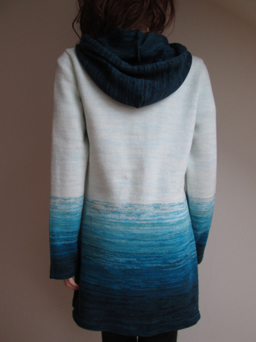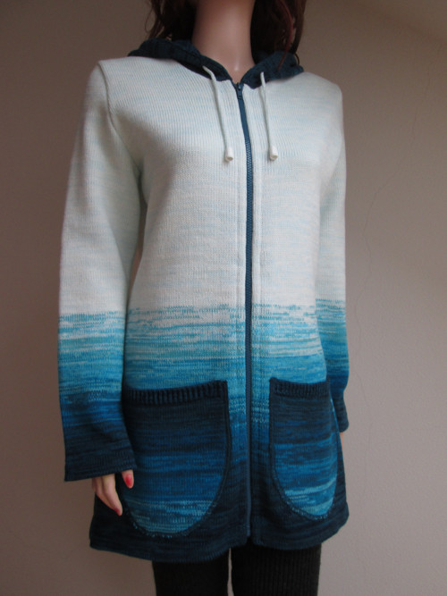 Středně silný pletený kabátek, kostěný zip, kapuca, 2 kulaté kapsy.