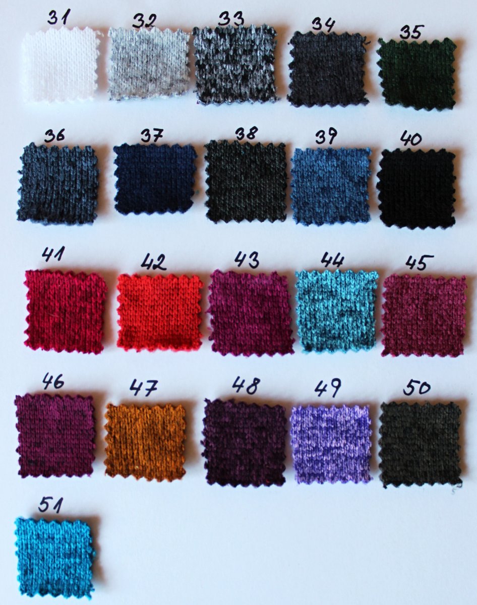 Barva je ilustrační-vyberte si svoji barvu.Barva 31-bílá,32-světle šedý melír,33-černo-bílý melír,34-šedý antracit,35-tmavě zelená,36-modro-šedá,37-tmavě modrá,38-černo-šedý melír,39-středně modrá-jeans,40-černá,41-červená,42-jasně červená(mrkvová),43-ostružina světlá,44-světlá tyrkysová,45-růžovo-fialová,46-ostružina tmavá,47-hořčičná,48-tmavě fialová(lilková),49-fialová,50-hnědá,51-tyrkysová.