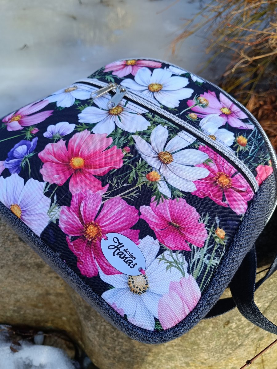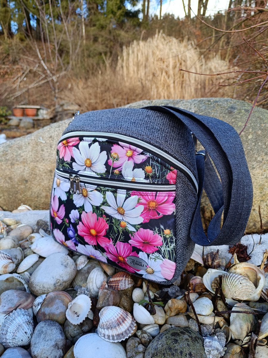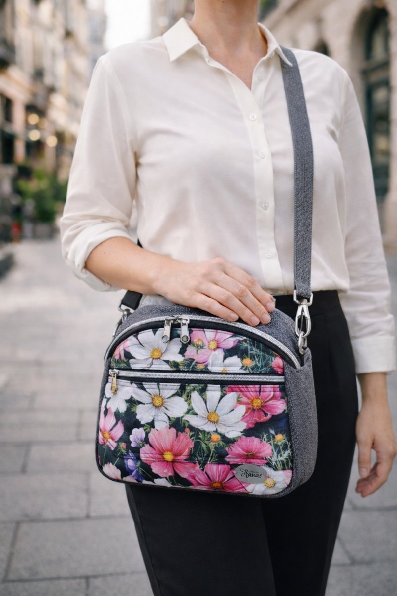 Stylová a originální kabelka ušitá z pevné, kvalitní látky v elegantní šedé a doplněna kočárkovinou s květy. Na první pohled působí menší, ale její hlubší dno překvapí – vejde se do ní vše potřebné pro každý den. Na předním i zadním díle je zipová kapsa. Uvnitř kabelky jsou další dvě kapsičky.