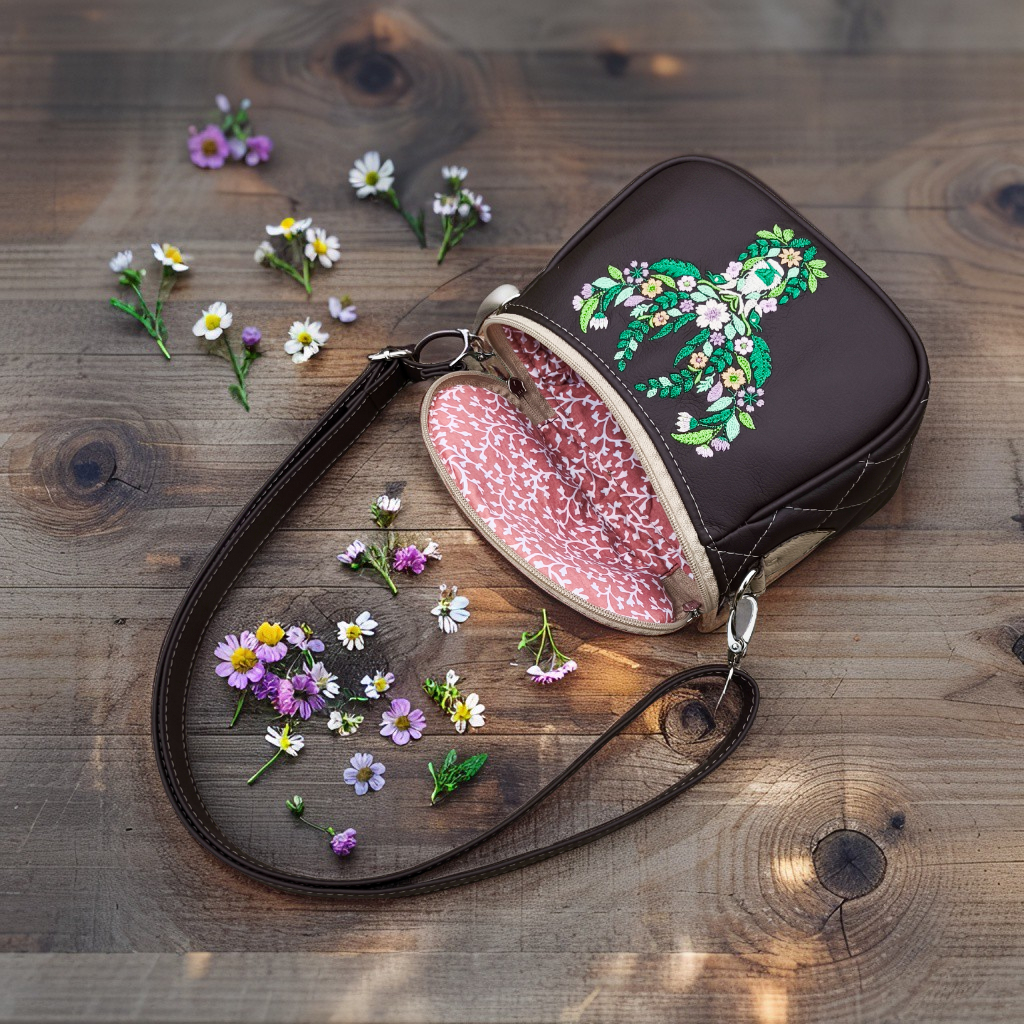 Menší baculatá kabelka je ušita z tmavě hnědé koženky, ozdobená výšivkou.Vstup do kabelky se uzavírá zipem s béžovou spirálou na dva jezdce (lze nosit na obou stranách těla).