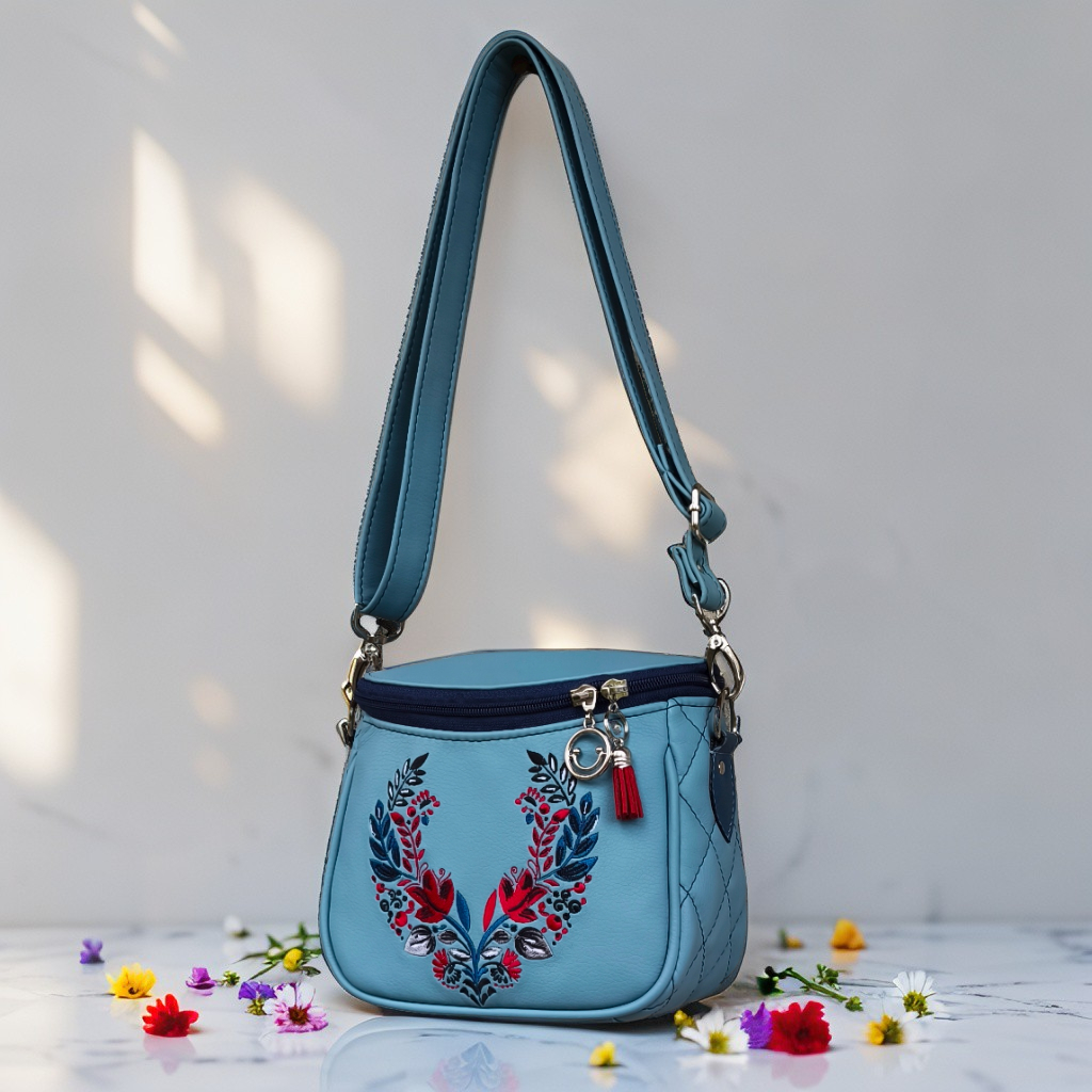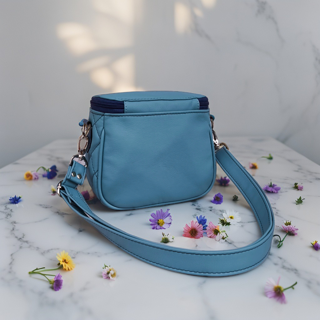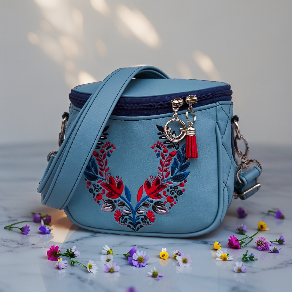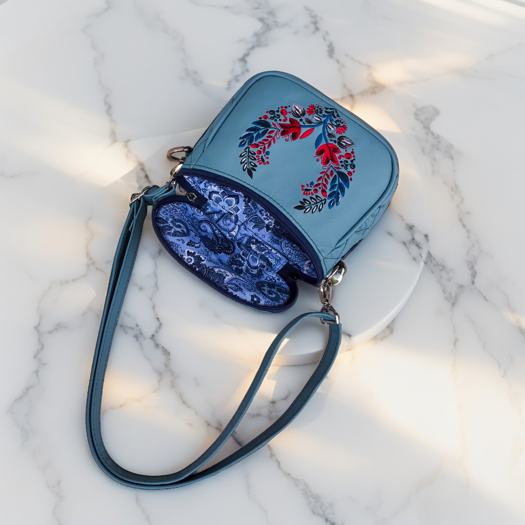 Menší baculatá kabelka je ušita z modro šedé koženky, ozdobená výšivkou.Vstup do kabelky se uzavírá zipem s tmavě modrou spirálou na dva jezdce (lze nosit na obou stranách těla).