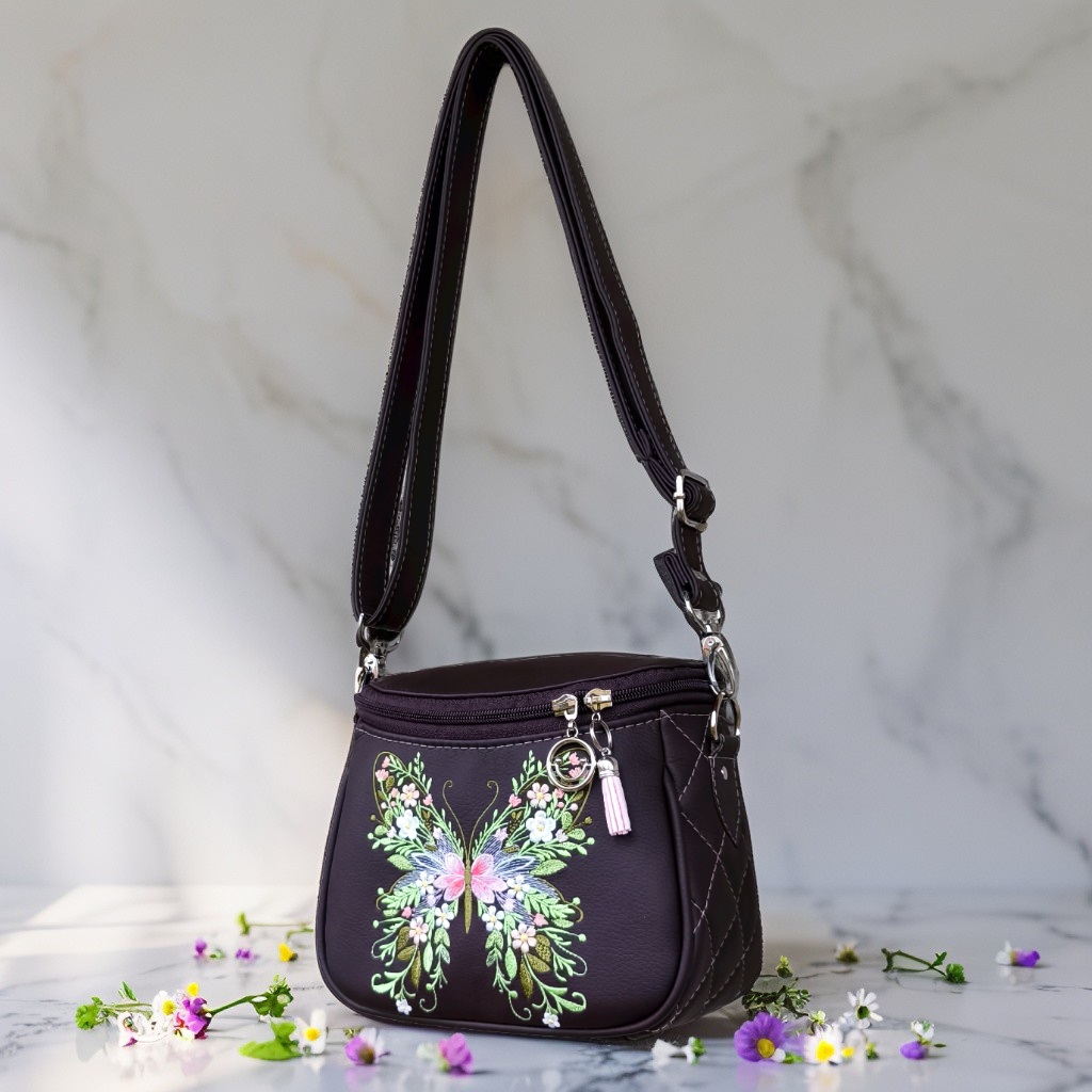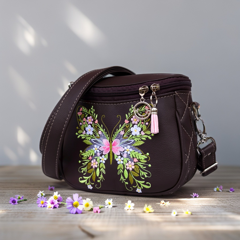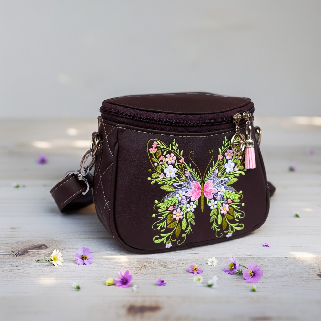 Menší baculatá kabelka je ušita z tmavě hnědé koženky, ozdobená výšivkou.Vstup do kabelky se uzavírá zipem s tmavě hnědou spirálou na dva jezdce (lze nosit na obou stranách těla).