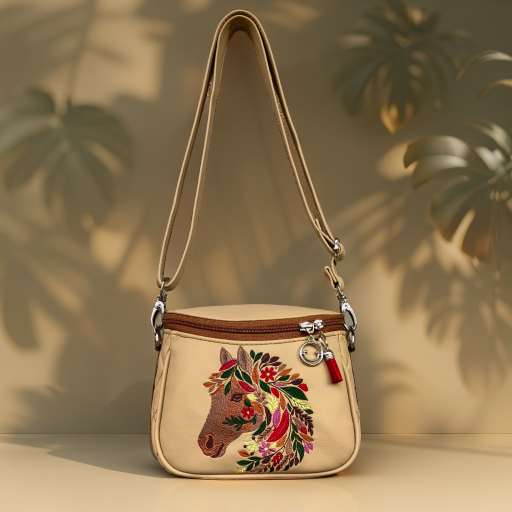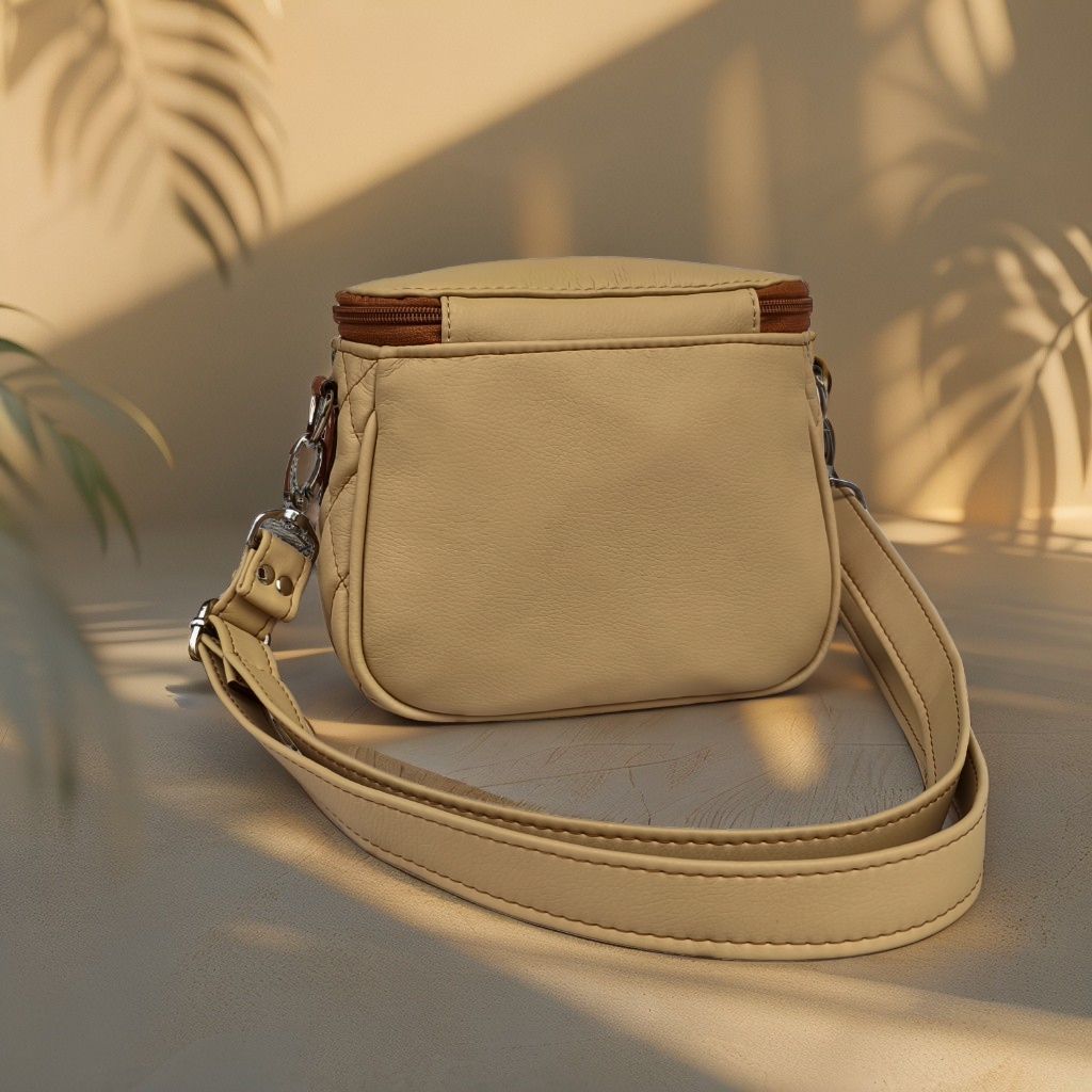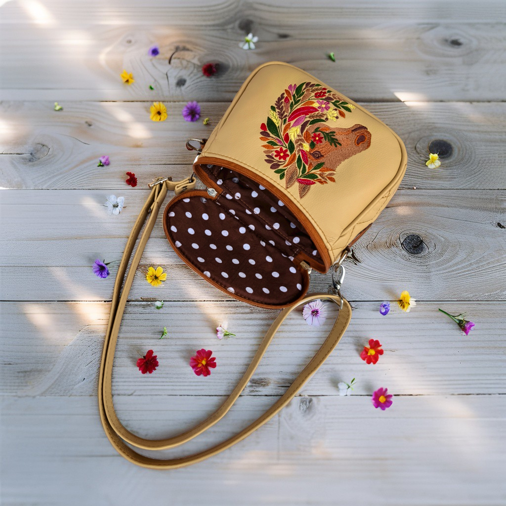 Menší baculatá kabelka je ušita z kávově béžové koženky, ozdobená výšivkou.Vstup do kabelky se uzavírá zipem s rezevě hnědou spirálou na dva jezdce (lze nosit na obou stranách těla).