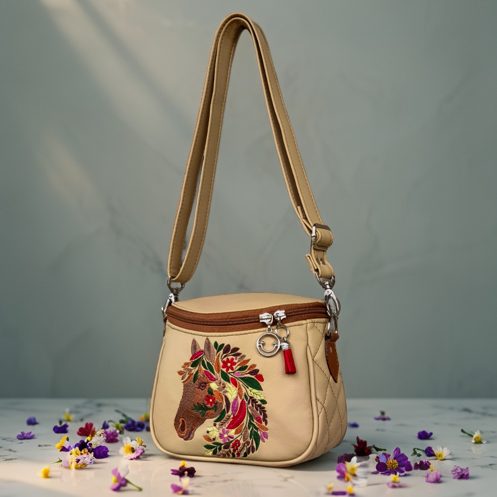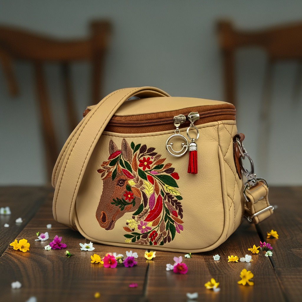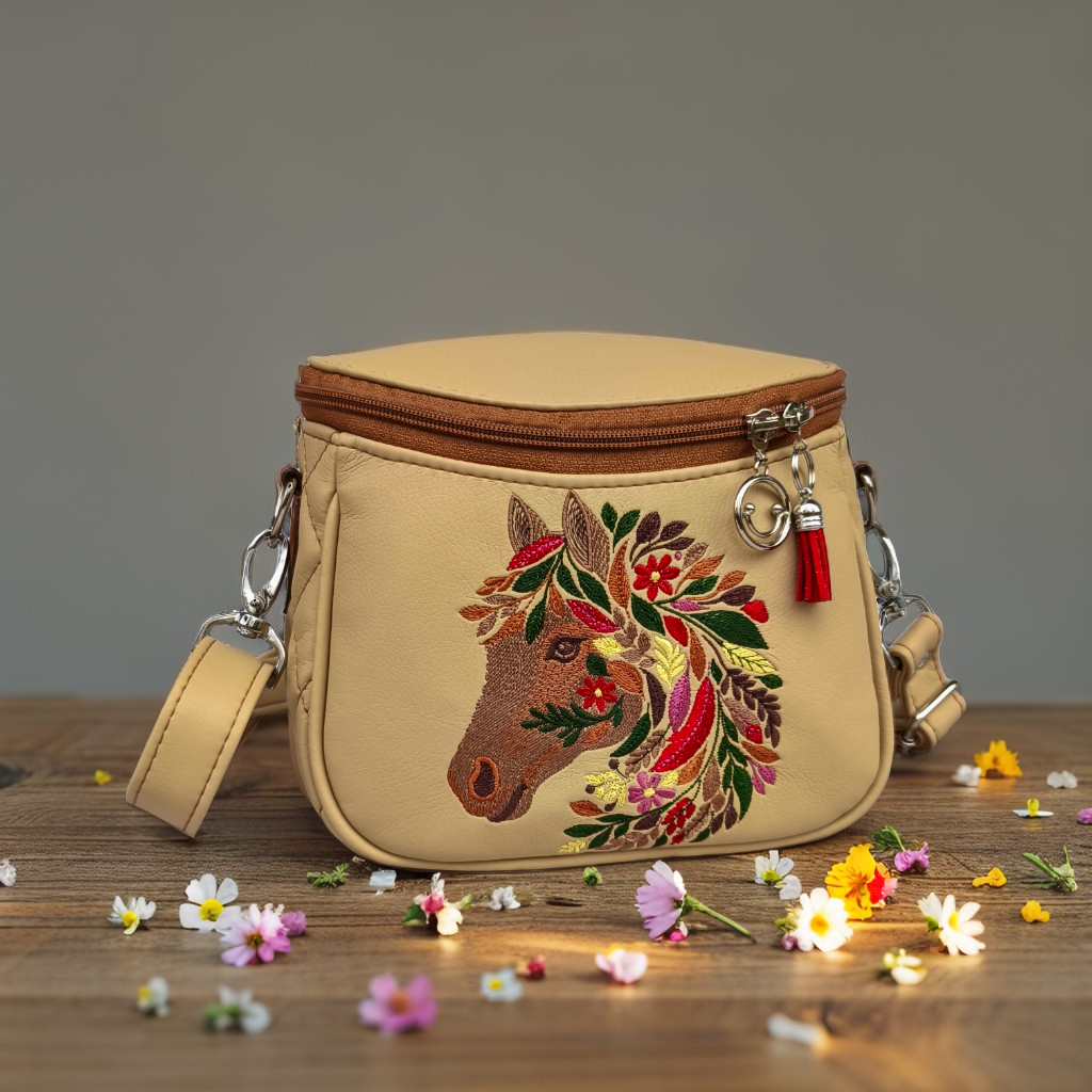 Menší baculatá kabelka je ušita z kávově béžové koženky, ozdobená výšivkou.Vstup do kabelky se uzavírá zipem s rezevě hnědou spirálou na dva jezdce (lze nosit na obou stranách těla).