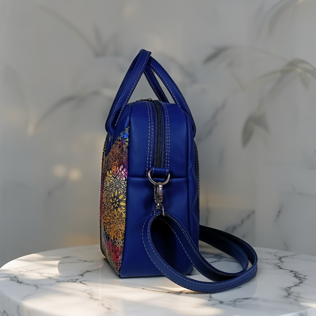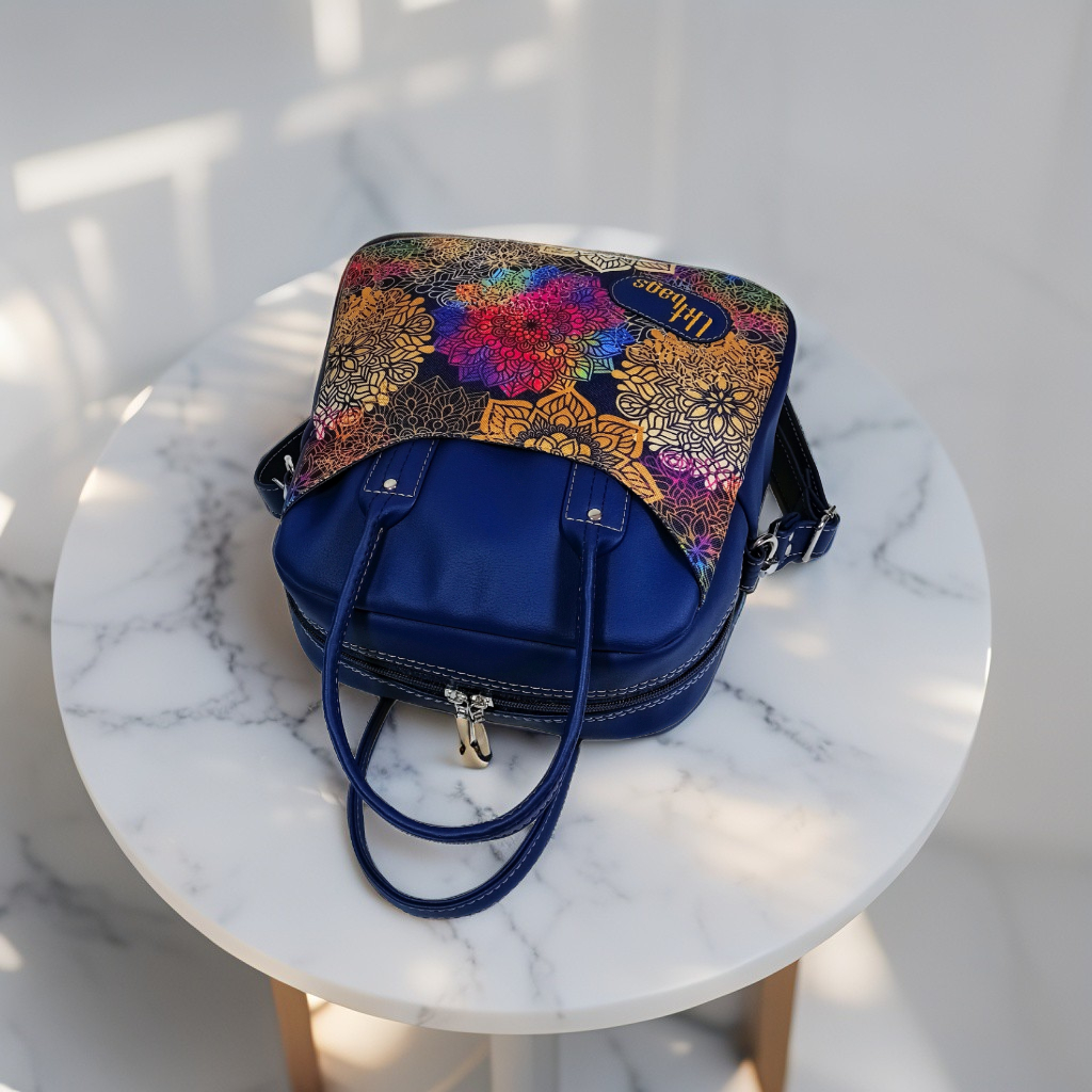 Středně velká kabelka ušitá z tmavě modré koženky a vzorované, nepromokavé látky, ozdobená vyšívaným logem.