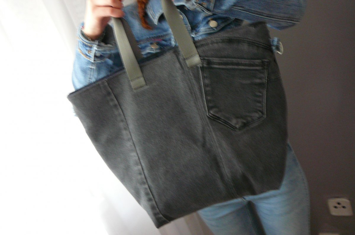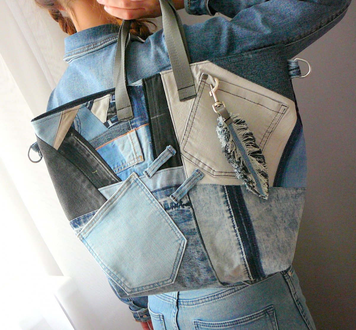 Kabelka ušitá z džínové recyklované látky, doplněná elementy z reci džínoviny. Vepředu jsou 2 kapsy zachované od původních riflí. Zapínání na magnet.