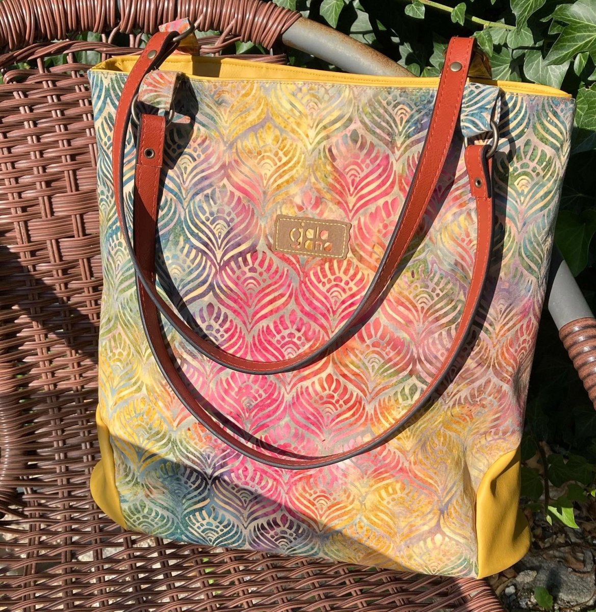 ušitá ze žluté koženky a bavlněné látky se vzorem