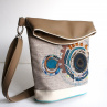 Originálna, praktická a pestrofarebná kabelka na rameno zhotovená podľa vlastného návrhu a strihu. Základné materiály - koženka a pevná poťahová látka sú kvalitné, trvácne a na dotyk príjemné. Čelná strana je dotvorená aplikáciou a ručnou výšivkou. Strih je upravený tak, že sa dá použiť v dvoch verziách. Hornú preklápaciu časť je možné preklopiť na obidve strany.