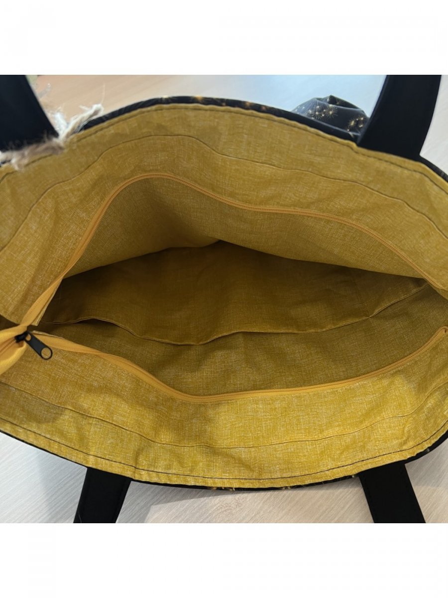 Taška z zimního softshellu se vorem žlutých pampelišek na černém podkladu. Nahoře je uzavíratelná zipem. Je vhodná i do deštivého počasí, protože je nepromokavá