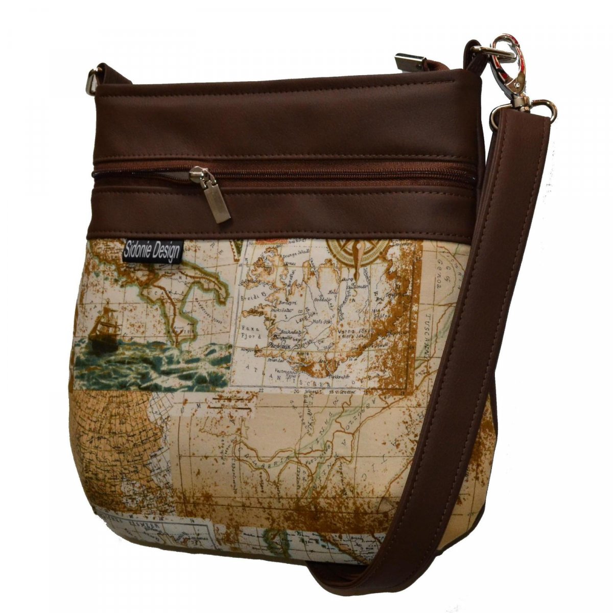 Hnědá koženka v kombinaci s elegantní látkou s mapou laděná dohněda, je elegantní a také praktická pro každou příležitost. Zadní strana a popruh je z hnědé kvalitní koženky. Každý kus je originál, motiv na látce je pokaždé jiný, podle střižení.