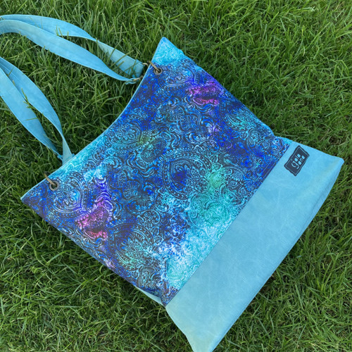 Crossbody kabelka ve větší velikosti ušitá z tyrkysové koženky doplněna o kočárkovinu s barevným motivem