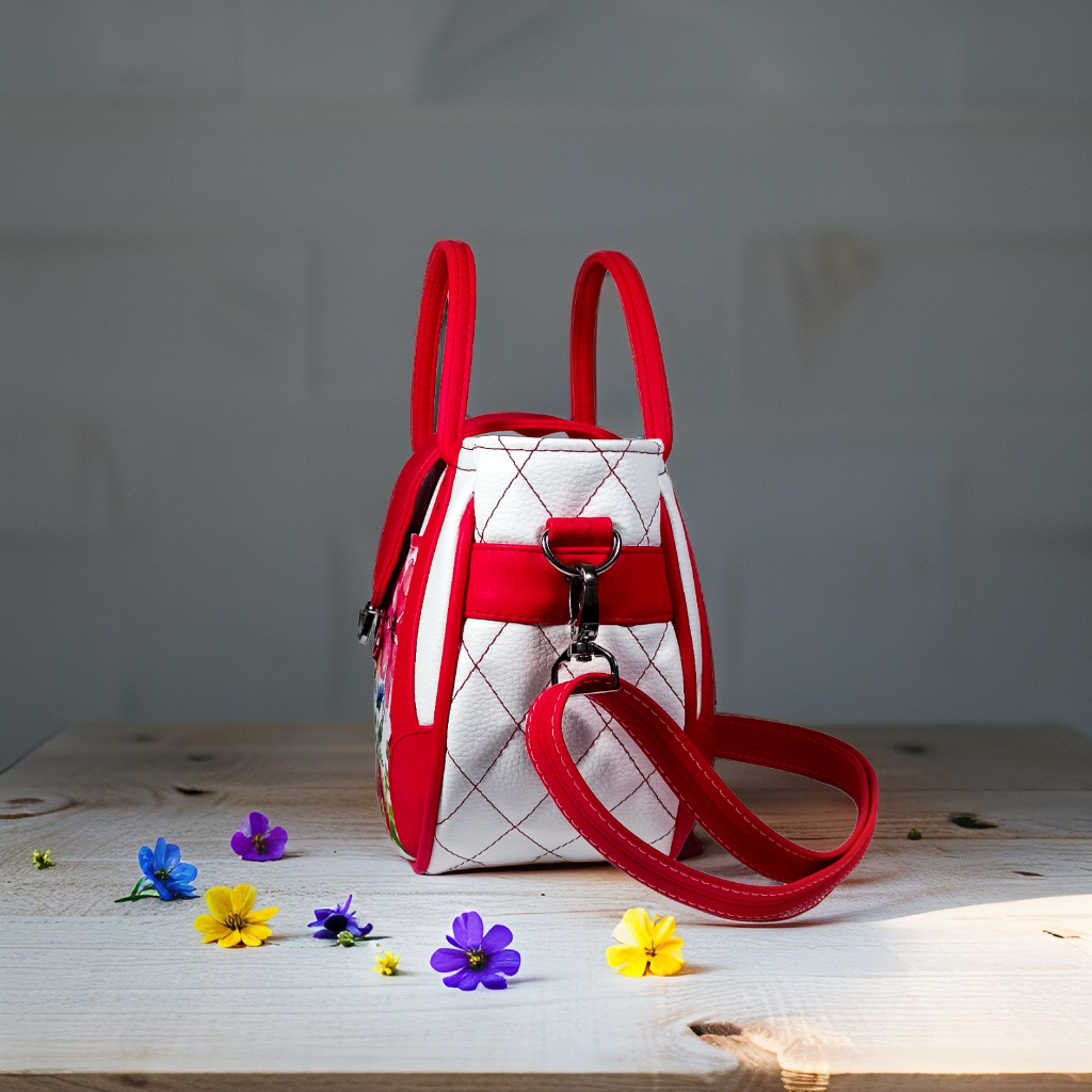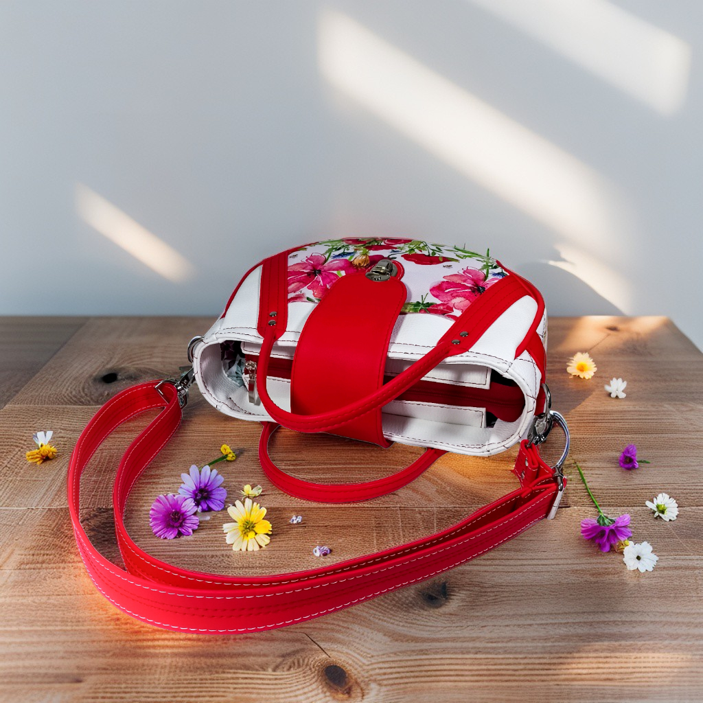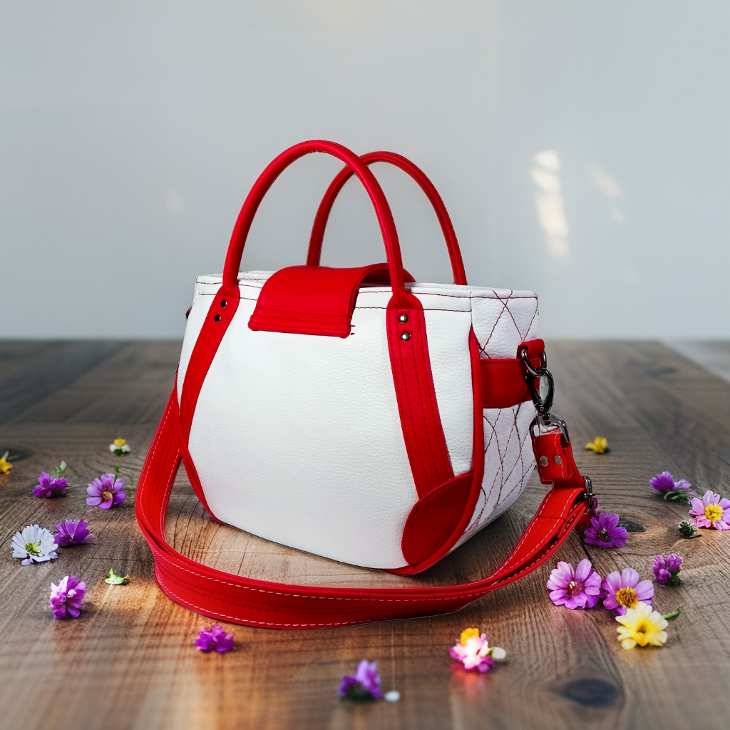 Stylová, středně velká kabelka ve tvaru košíčku, z bílé a červené koženky v kombinaci s nepromokavou látkou.