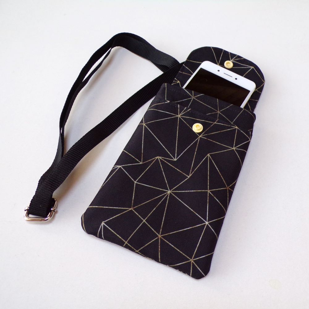 Malá kabelka, pouzdro na mobil, šitá z kočárkoviny, pevně vyztužená, bavlněná podšívka. Kabelka má dvě kapsy, zapínání na klopu s patentkou. Popruh je nastavitelný dle potřeby, lze nosit přes rameno nebo jako crossbody. Velikost kabelky je 18 x 12 cm.