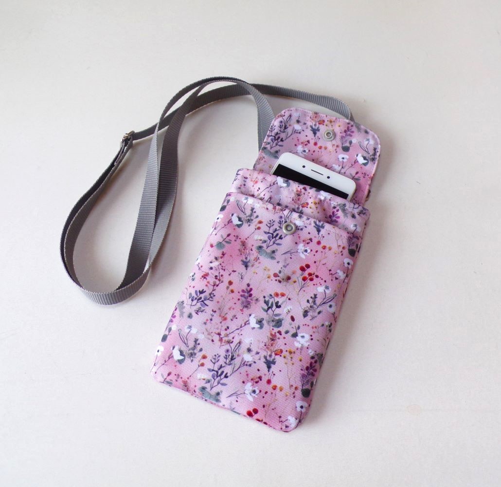 Malá kabelka, pouzdro na mobil, šitá z kočárkoviny, pevně vyztužená, bavlněná podšívka. Kabelka má dvě kapsy, zapínání na klopu s patentkou. Popruh je nastavitelný dle potřeby, lze nosit přes rameno nebo jako crossbody. Velikost kabelky je 18 x 12 cm.