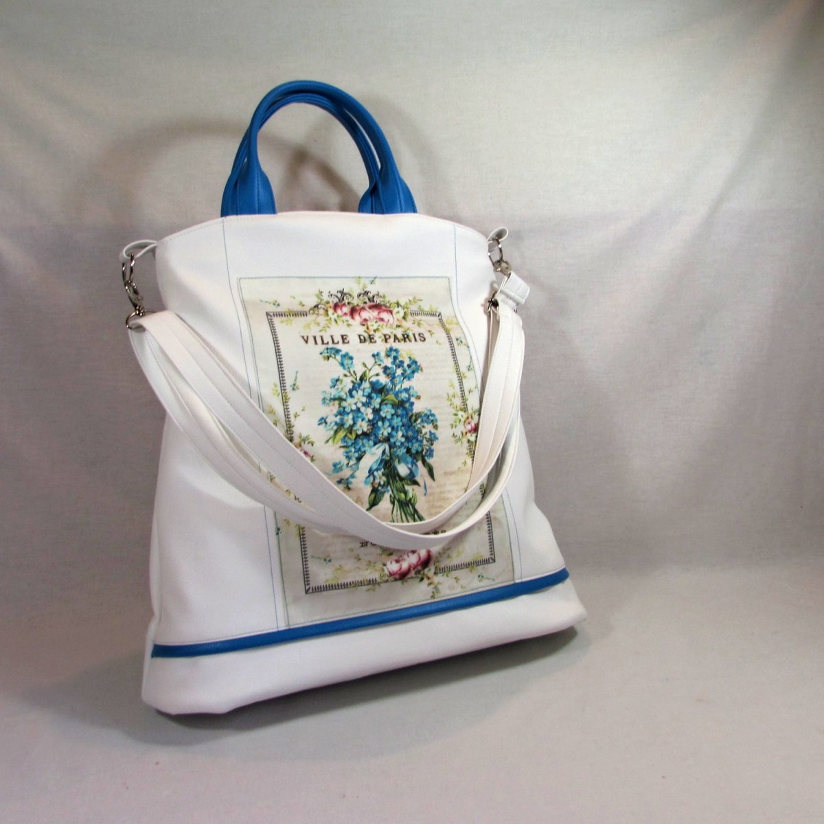 ušitá ze světlounké koženky,přední díl zdobí látkový panel s motivem pomněnek