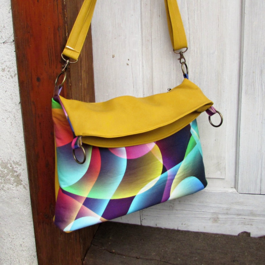 velká ,prostorná , překlápěcí taška ušitá z krásné bavlněné látky s barevným motivem a žluté koženky
