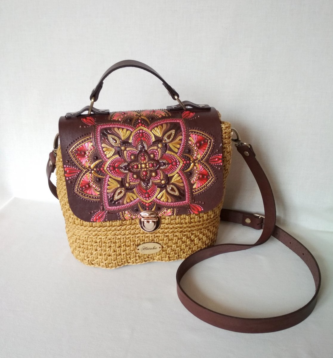 Je doplněná ručně malovanou klopou z kůže.