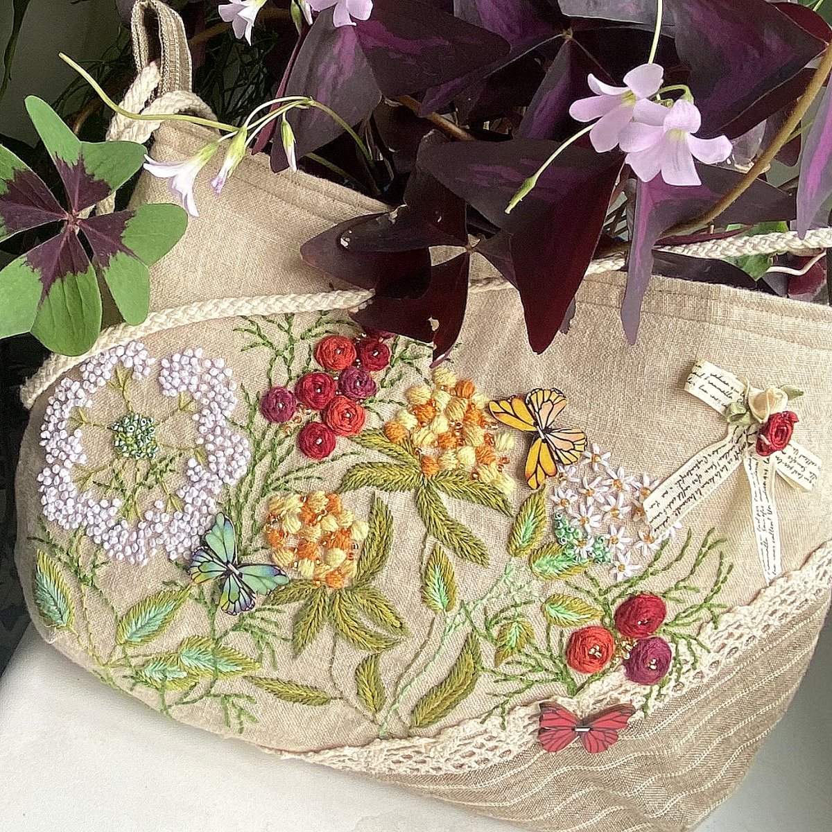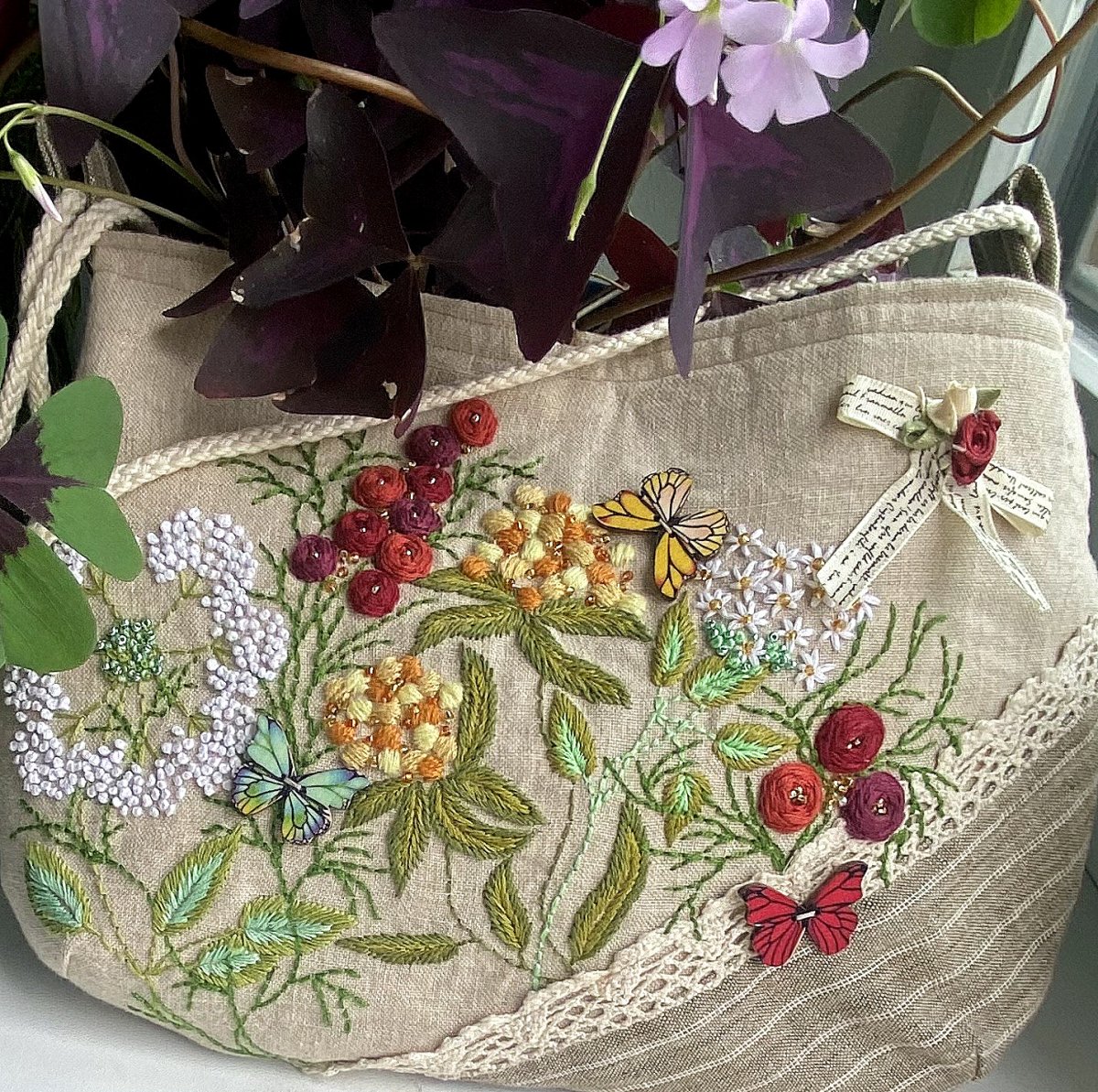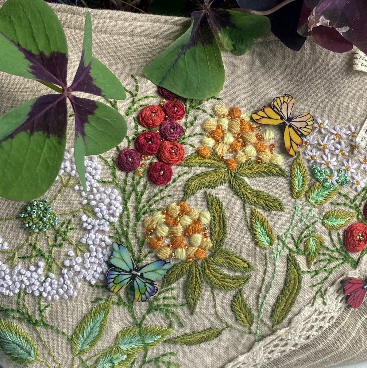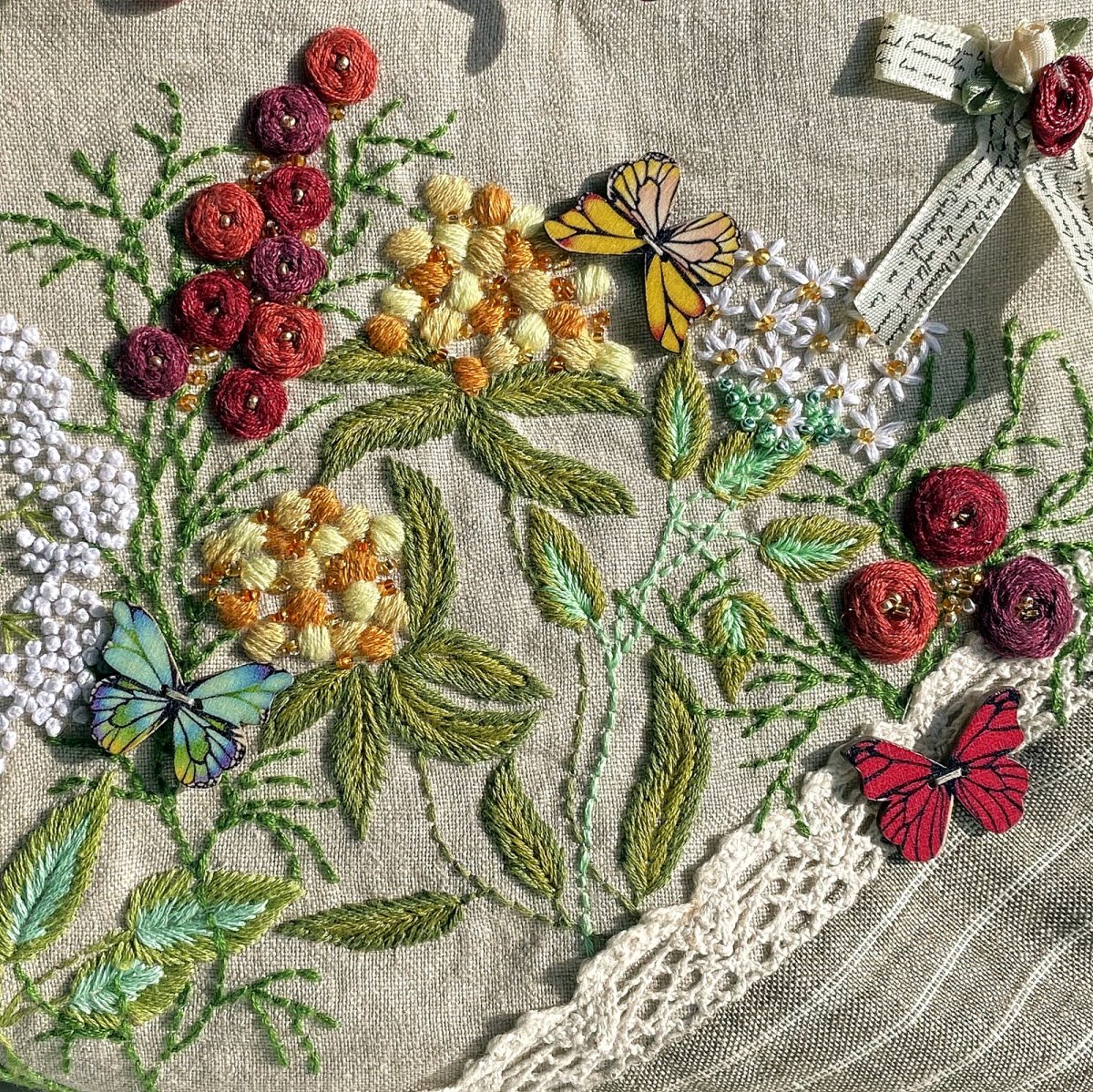 Přední díl je ručně vyšívaný z volné ruky, bez předlohy, tak jak si výšivka sama vedla ruku. Výšivka je doplněna bavlněnou krajkou a krásnými knoflíky - motýlky. Celá výšivka je doplněna spoustou korálků.
