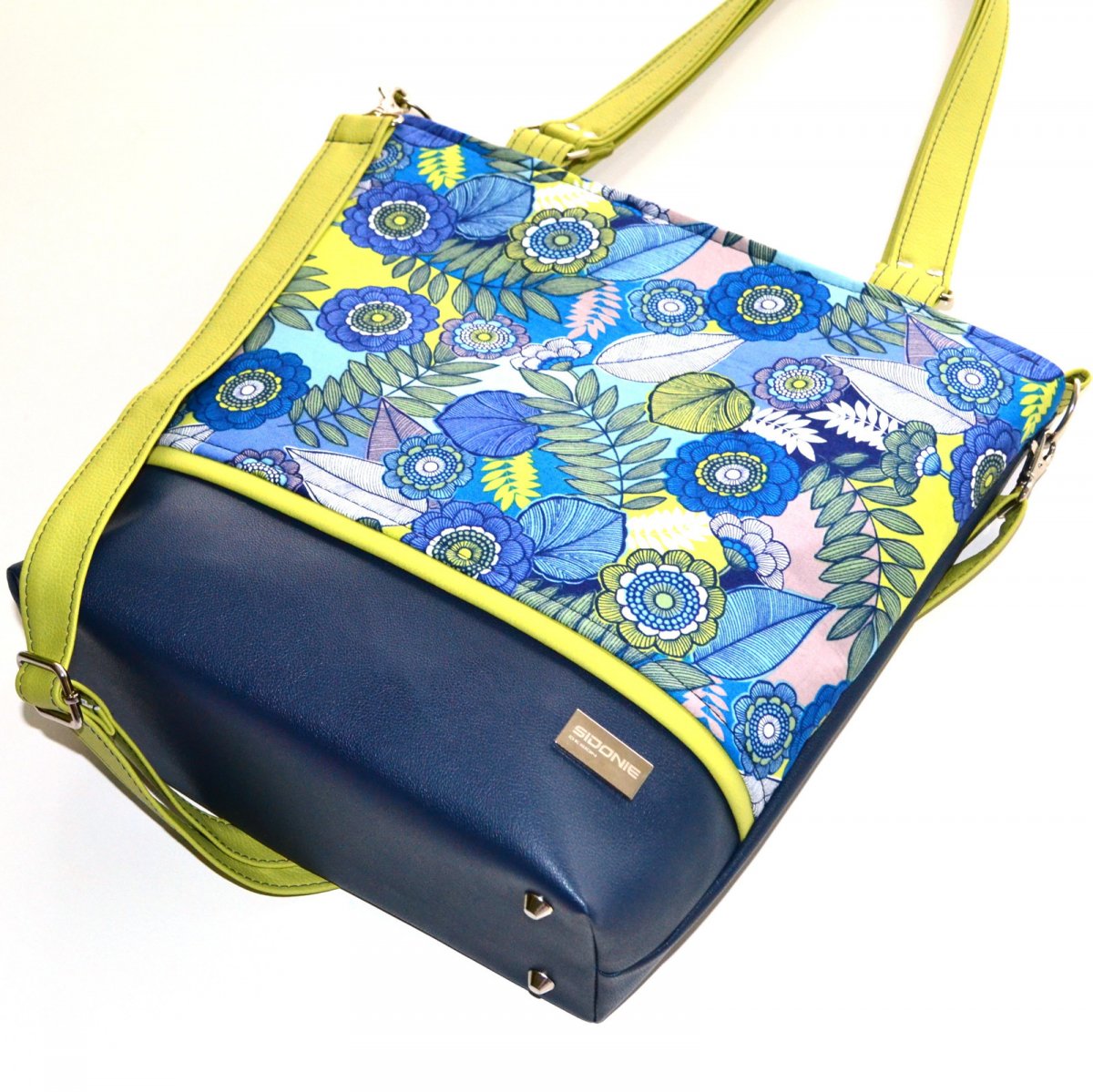 Tmavě modrá koženka v kombinaci s elegantní látkou s modro béžovo limetkovým podkladem a modrými květy. Zadní strana je z tmavě modré koženky. Popruh je z limetkové kvalitní koženky.