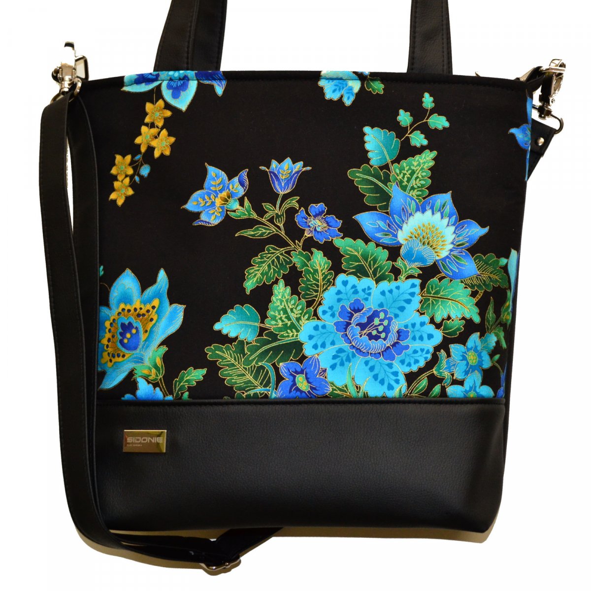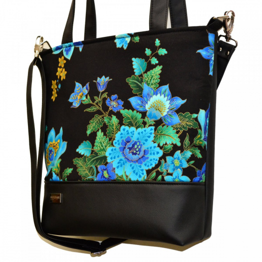 Černá koženka v kombinaci s elegantní látkou s černým podkladem a barevným tiskem. Popruh je z černé kvalitní koženky.