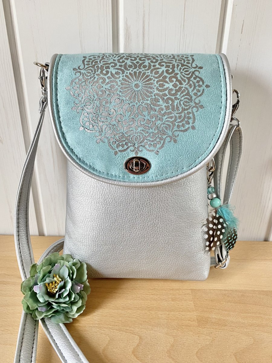 Použitá, vysoce kvalitní koženka je ve světle tyrkysové barvě na klopě s imitací broušené kůže v kombinaci se stříbrnou.