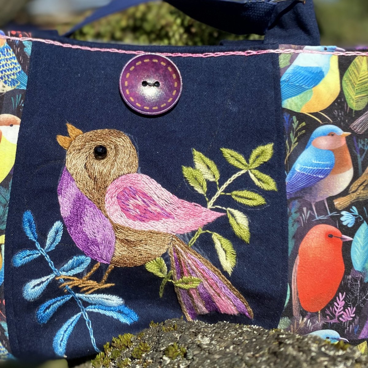 Střed předního dílu je ručně vyšívaný , motiv výšivky využil stylizovaně vzor na látce, ze které je kabela ušitá. Výšivka je na džínové látce.