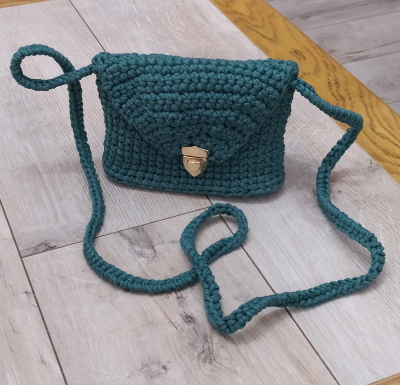 Kabelka je háčkovaná z bavlněných šňůr a není podšitá, ale je i tak pevná. Má jedno ucho dlouhé, takže se dá nosit i přes rameno. Dno je pevné.